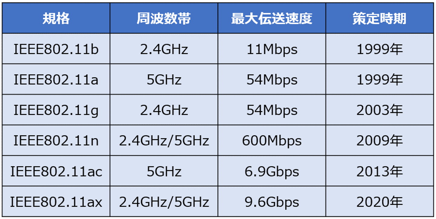 ポイントとしてはどの規格がどんな周波数帯に対応しているのか、最大伝送速度はどれくらいあるのかを押さえておきましょう。