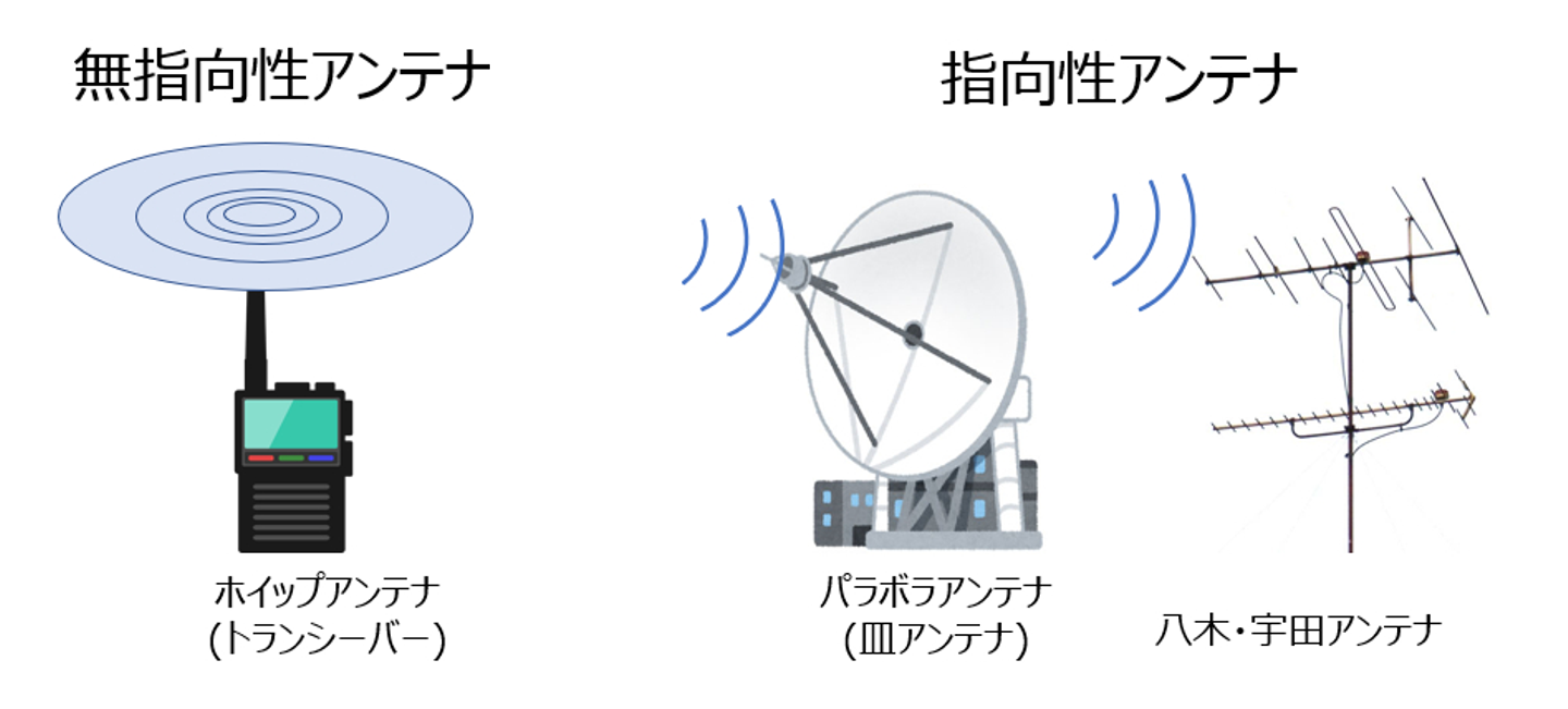 アンテナの種類によって指向性などの違いがあります。指向性とは、電波や音などの強さが方向によって異なることをいいます。また指向性の方向は水平だけでなく、垂直にも向きます。指向性アンテナの代表的なアンテナとしてパラボラアンテナ、八木・宇田アンテナなどがあります。