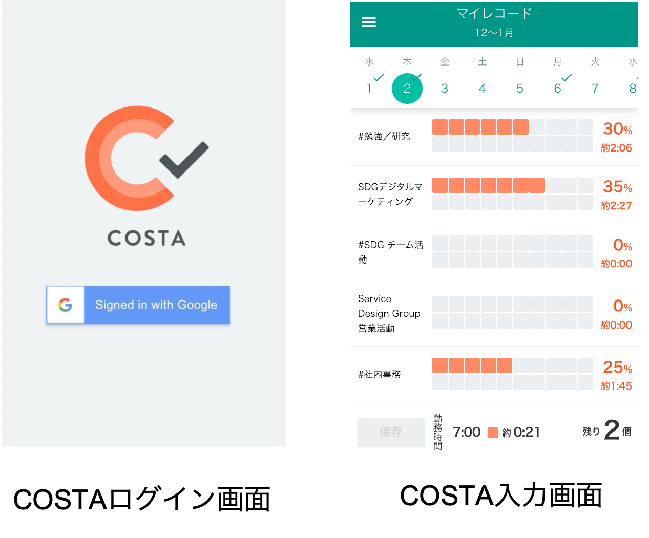 COSTAとは、ニューロマジック社内の工数の管理を行うシステムです(ここでの工数とは、作業にかかった時間のことを指します)。プロジェクトに1日の何割くらい費やしたか記録し、収支を割り出します。
