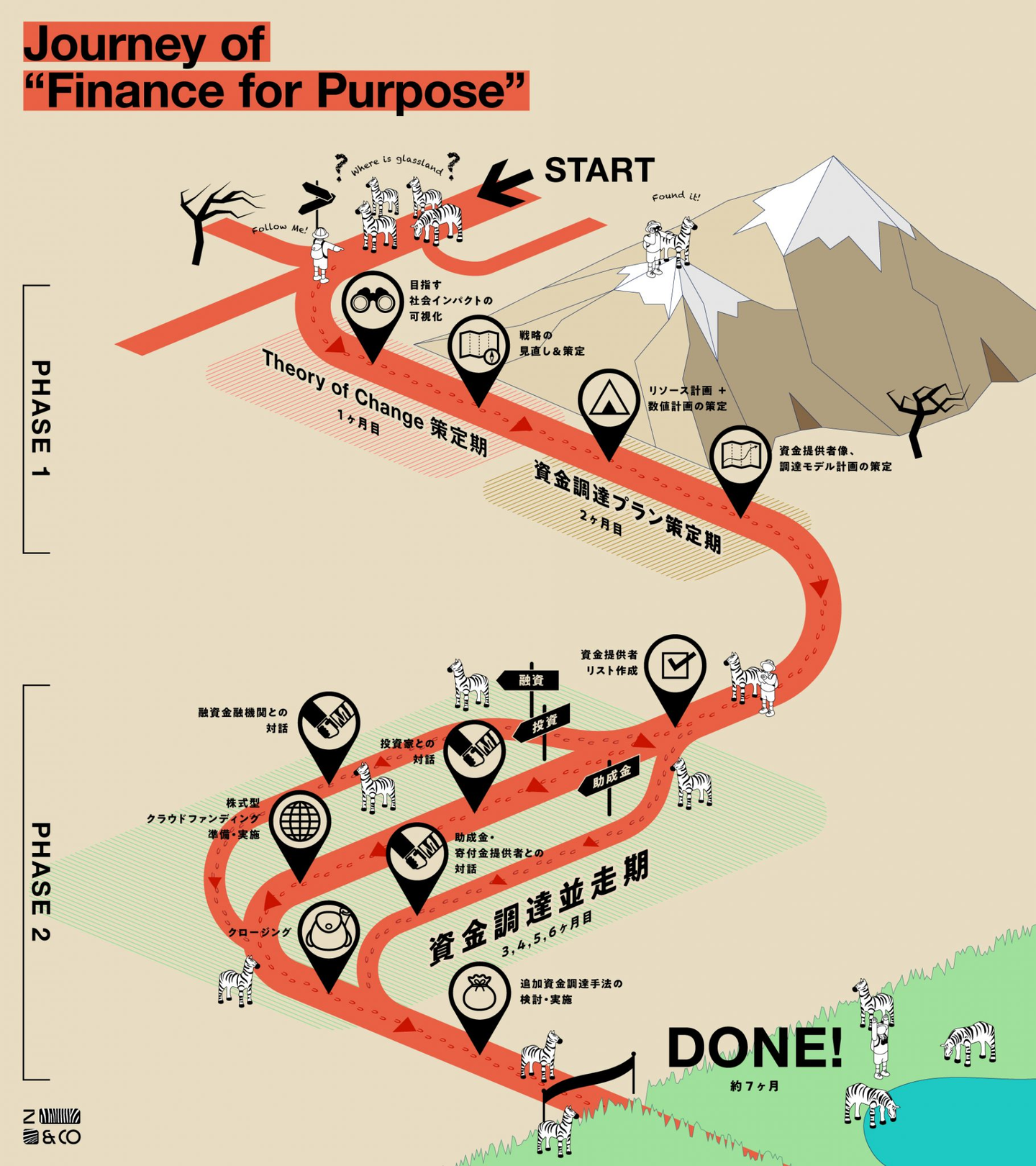 理念をビジネスにするためには資金が必要ですが、この出資者が理念に共鳴できているか?ということが今後の企業活動にも大きく関わります。Zebras and Companyの調達プロセスでは、企業理念、理念をもとに行う企業活動によって生み出す社会インパクト可視化をすることにまず着手し、整理した上で、資金調達プランを策定する。この丁寧なプロセスを踏むことで、ミスマッチを減らし、経営者自身が理想とする企業活動を後押ししています。