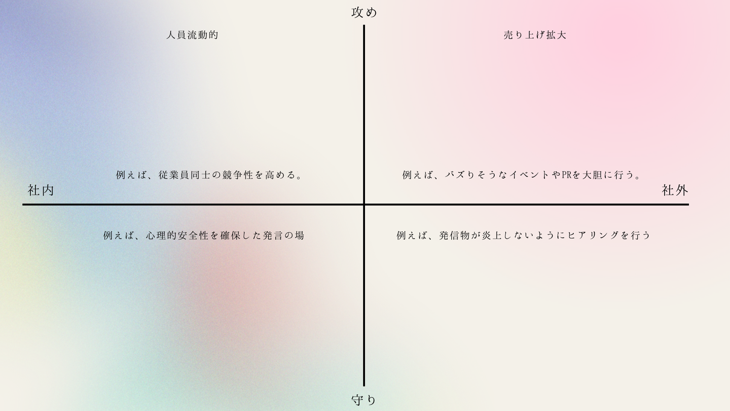 また、同時に企業におけるディフェンスとして、従業員が自分らしく働けるように、発言しやすい会議体を設計するといった一見してダイナミックな取り組みではないけれども、一人ひとりを尊重する活動も見落としてはならない視点だと共有くださいました。
