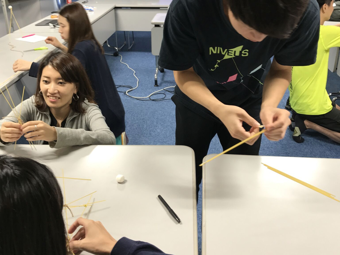 パスタ(20本)、テープ(90cm)、ひも(90cm)、マシュマロ(1個)、ハサミ(1個)を使って、自立可能なタワーを立て、最も高いタワーを作ったチームの優勝となるゲームです。タワーの上にはマシュマロを置かなければならず、下からマシュマロの高さまでを計測して競います。プレイ時間は戦略タイムも含めて18分。計測中もタワーが自立していなければならず、倒れた場合は0cmとなります。(詳しくはマシュマロチャレンジで検索してください)
