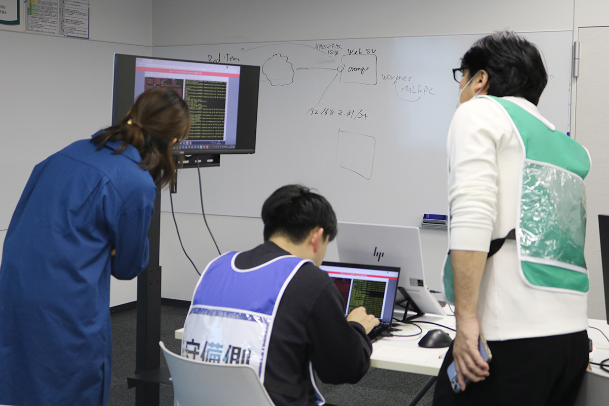 さらに、各チームのリーダーが「今、レッドチームはこんな脆弱性を突いていますね」「おっとブルーチーム、このログに気づけるか!?」といったリアルタイム実況解説まで行う豪華仕様。これにより、参加者だけでなく、見学者も一体となって演習の醍醐味を味わうことができました。