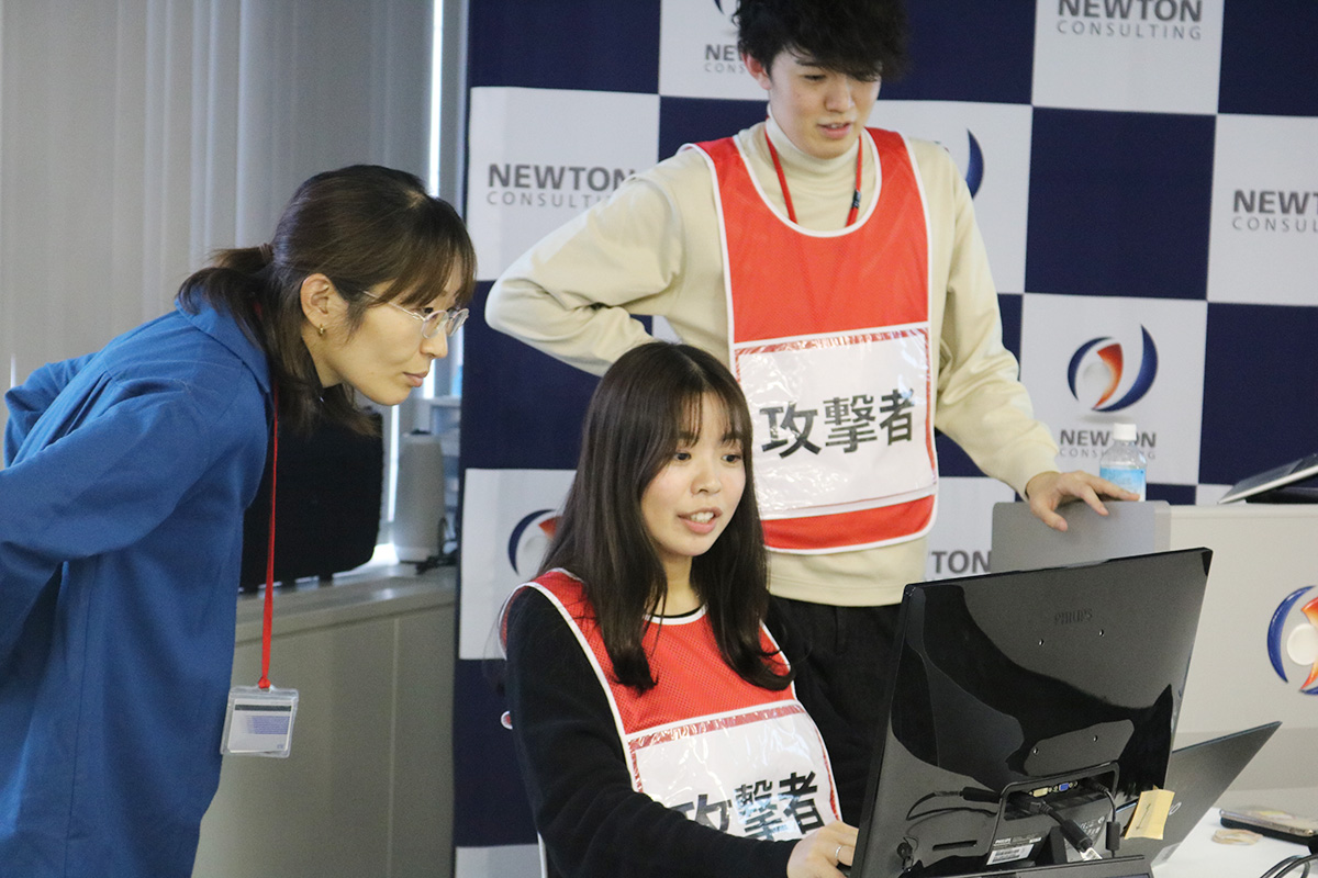 会場では、攻撃側のレッドチームと防御側のブルーチームが、それぞれのチームカラーを示すビブスを着用。PCと向き合い、黙々とキーボードを叩く姿は真剣そのものですが、傍から見ればまるでeスポーツの大会のような雰囲気です。プロの技術者たちが、こうして本気で「対戦」に没頭するのも、ニュートンらしい光景です。