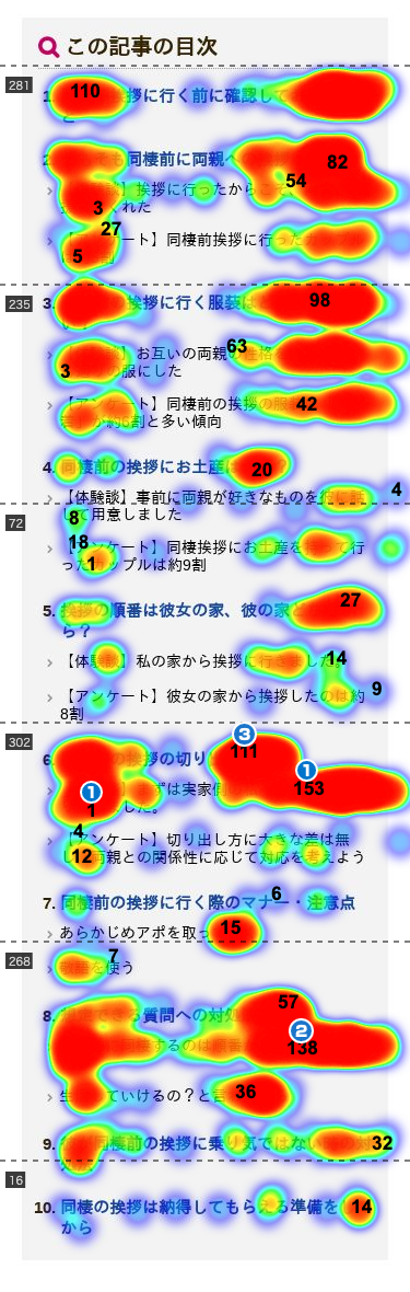 以下が実際にクリックされた分布のデータです。①とついているところが、一番クリックされています。