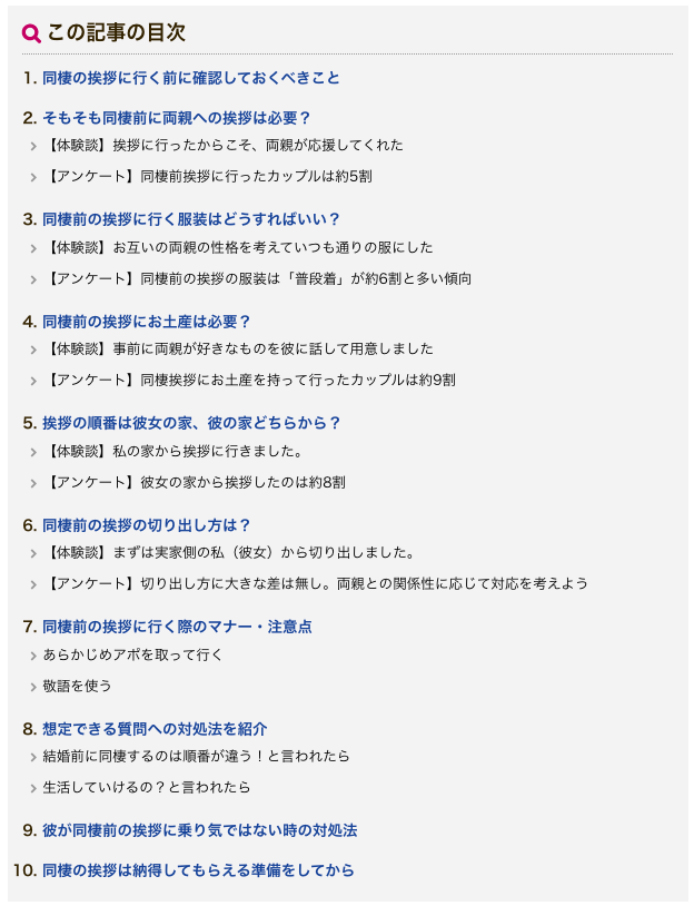 検索キーワードからユーザーニーズを推測すると、一緒に暮らそうと決めたカップルが、両親への挨拶へ行くことに関して、疑問や不安を解消したいと思って検索していると考えられます。