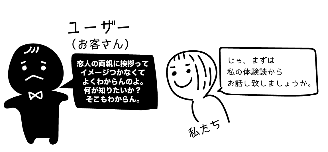 これらの情報をもとに、ユーザー像を統合すると、「すぐには結婚は考えていない。だけれど大好きな彼女と一緒に暮らしたい。そのために初めて彼女の両親に挨拶に行くアラサーの男性」のイメージがが浮き彫りになってきました。