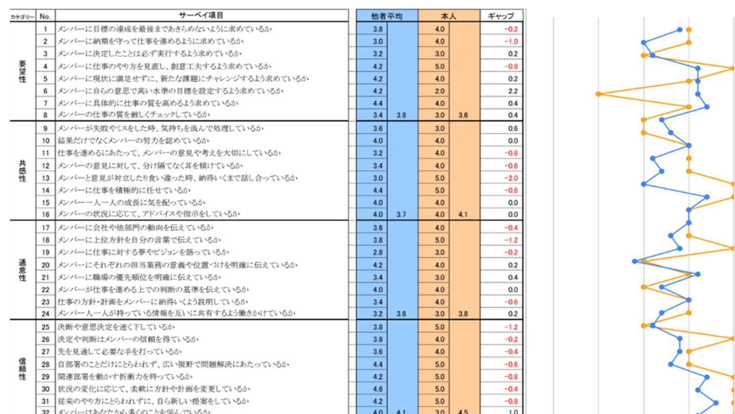 まずはそのシートをもとに、評価が高かった項目・低かった項目・自己評価と他者評価にギャップがあった項目を自分なりに整理。「なぜそうだったのか?」をじっくり振り返り、分析していきます。