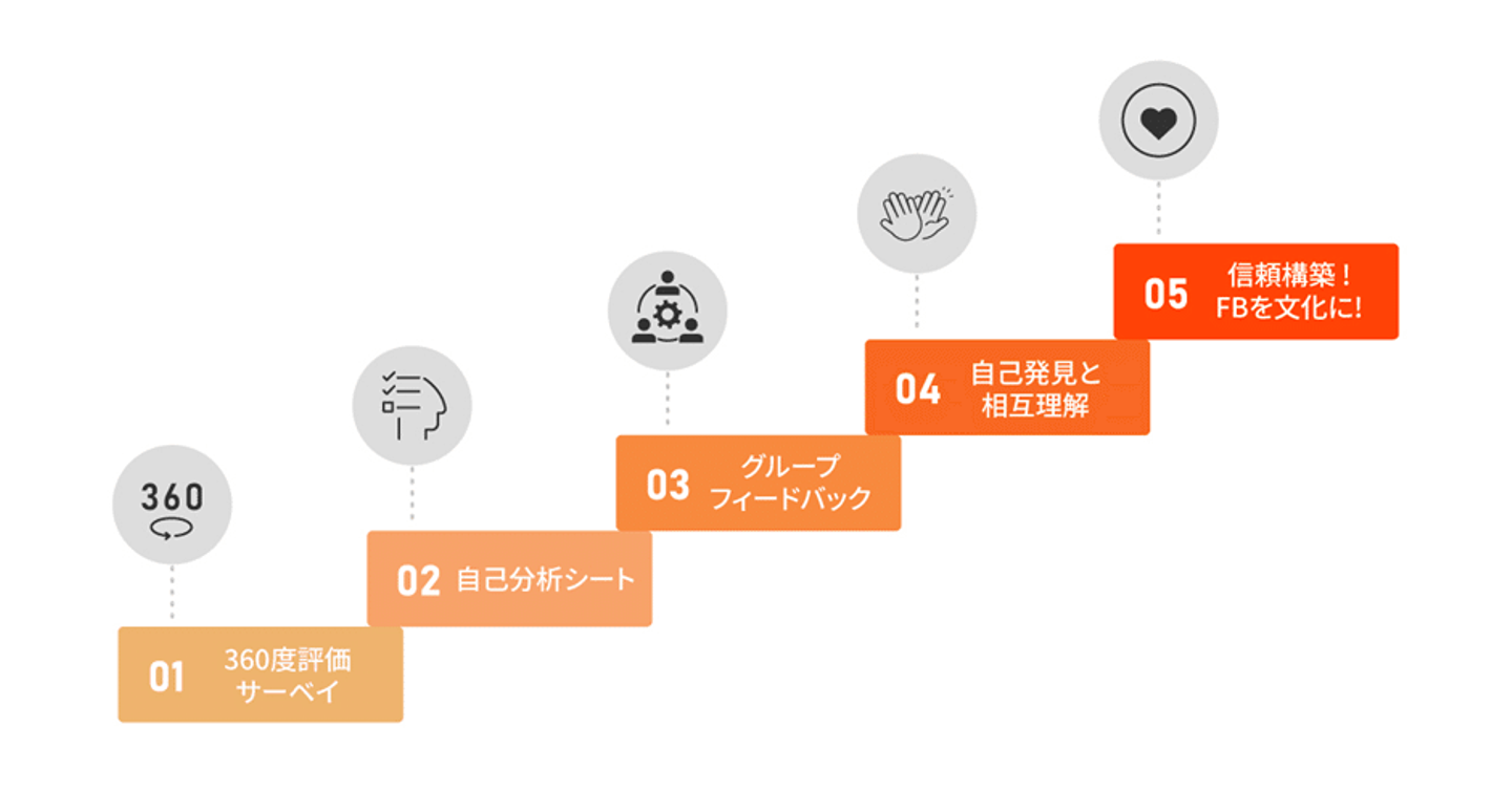 メインコンテンツは、事前に実施した「360度評価サーベイ」のフィードバックです。サーベイでは、「主体性」「チームワーク」「キャリア」「信頼」の4つの観点から、メンバー同士が互いを5段階で評価。もちろん、自分自身の自己評価も記入します。