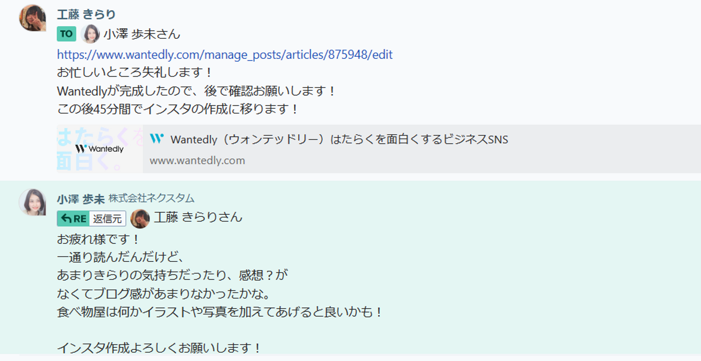 各作業が終わるごとに歩未さんにチャットを送りお互いに確認をするため、