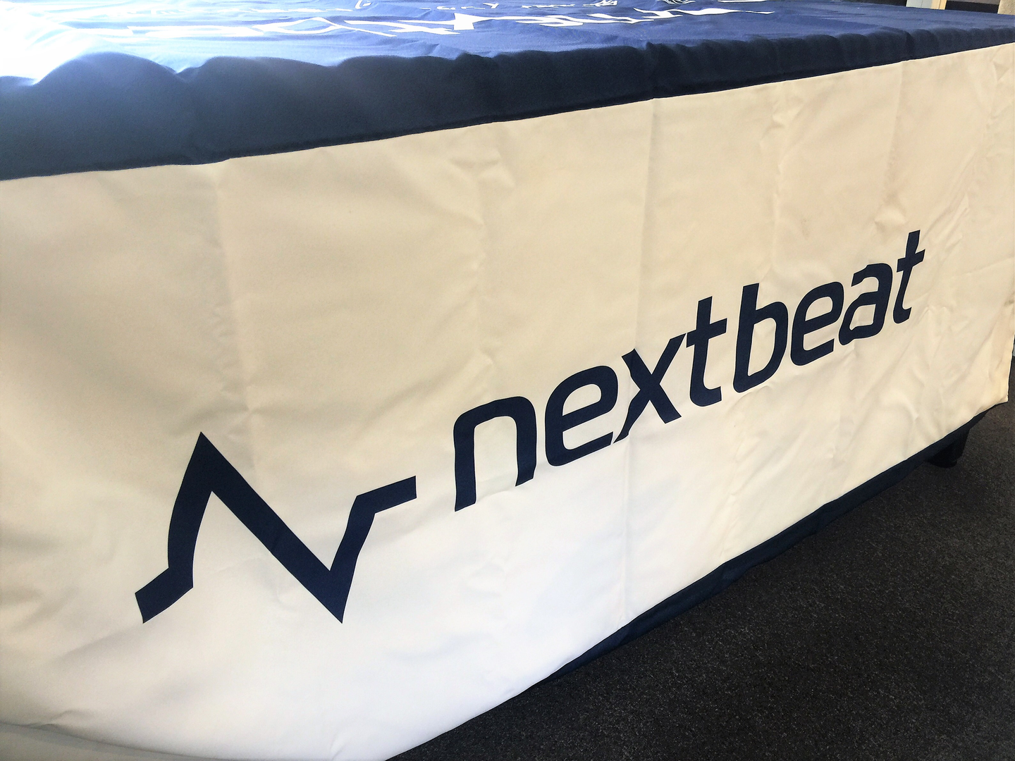 ネクストビートの白地に紺色のロゴが入ったテーブルクロスが目印です!↓↓