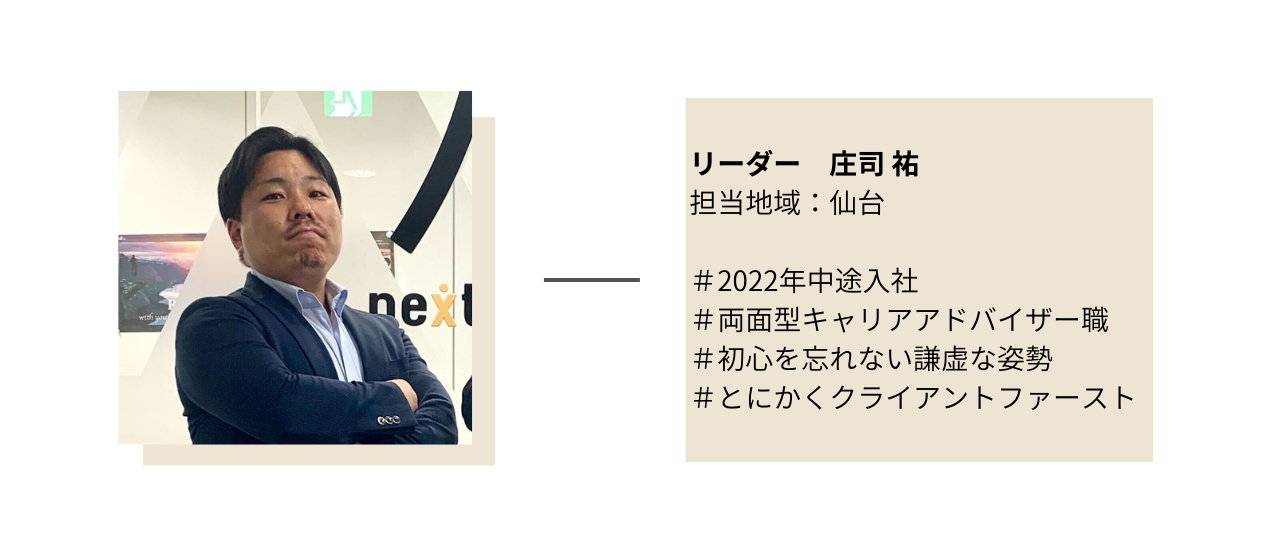2021年6月中途入社。前職は2017年に新卒で不動産会社に入社し、投資用マンションの営業として飛び込み営業を2年経験し、その後マネジメントも経験。東京から仙台へのUターンを機に2021年にネクストビートに入社。入社後は保育士バンク!キャリアアドバイザー職に従事し、2022年10月にリーダーに昇格。現在は東北6県と北関東3県のマネージャーを務める。