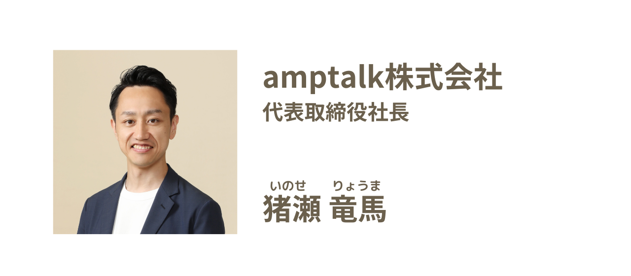 代表取締役社長 猪瀬 竜馬 。2010年に早稲田大学卒業後、大手化学メーカーにて営業・マーケティングを経験。2年間ペンシルバニア州にある米国の医療機器メーカーでProduct Marketing Managerを経験し、営業500名に対しSales Enablementツールを用いたDXのプロジェクトをリード。2018年スペインie business schoolにてMBAを取得。その後、2020年にamptalk株式会社を設立。米国セールスイネーブルメントの大家マイクカンクル氏の名著「ビルディングブロック式セールスイネーブルメント」を翻訳/監修/出版。