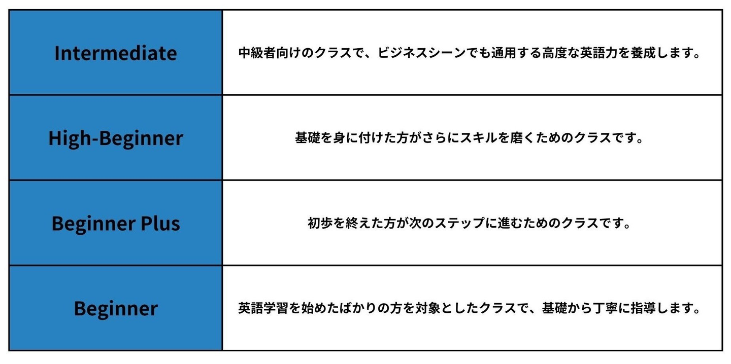 クルーの多様なニーズに応えられるよう、レベル別にクラスを分けているので、実用的な英会話を習得したいのであれば、ゼロからのスタートでも受講することができます。