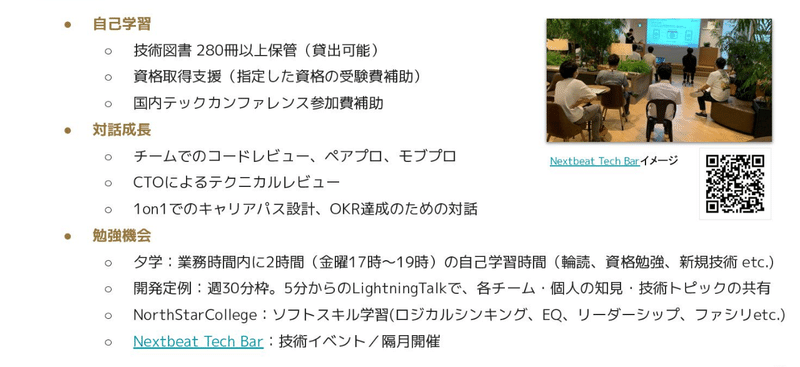 エンジニア組織には「勉強機会・自己学習・対話成長」といった独自の成長支援があるのですが、そのなかからいくつかご紹介していきます。