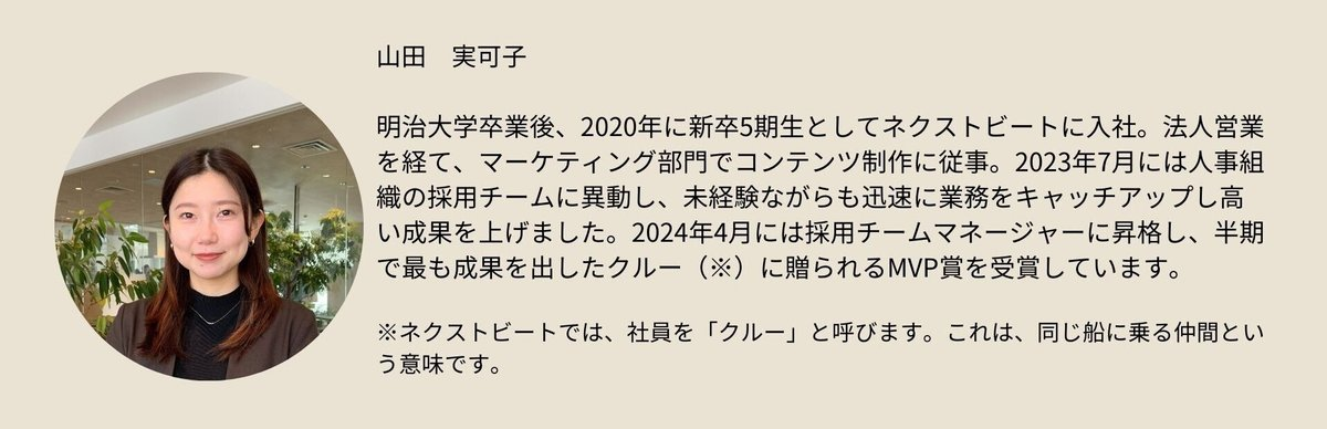 山田:通常は選考に関するフィードバックが中心ですが、NEXTBEAT HUBでは代表の考える採用像やネクストビートに合う人材について幅広い視点で話すことができました。ラフに話してくださるので、将来の目標やキャリアについても相談したことがあります。