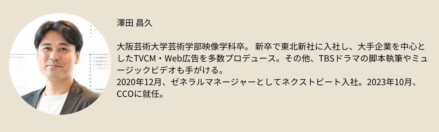 本記事では、ネクストビートの動画コンテンツがどのように制作され、どのように顧客や視聴者に価値を提供しているのかを、クリエイティブチームの責任者である澤田CCOにインタビューしています。制作プロセスや成功事例を通じて、ネクストビートの魅力を詳しくご紹介します。