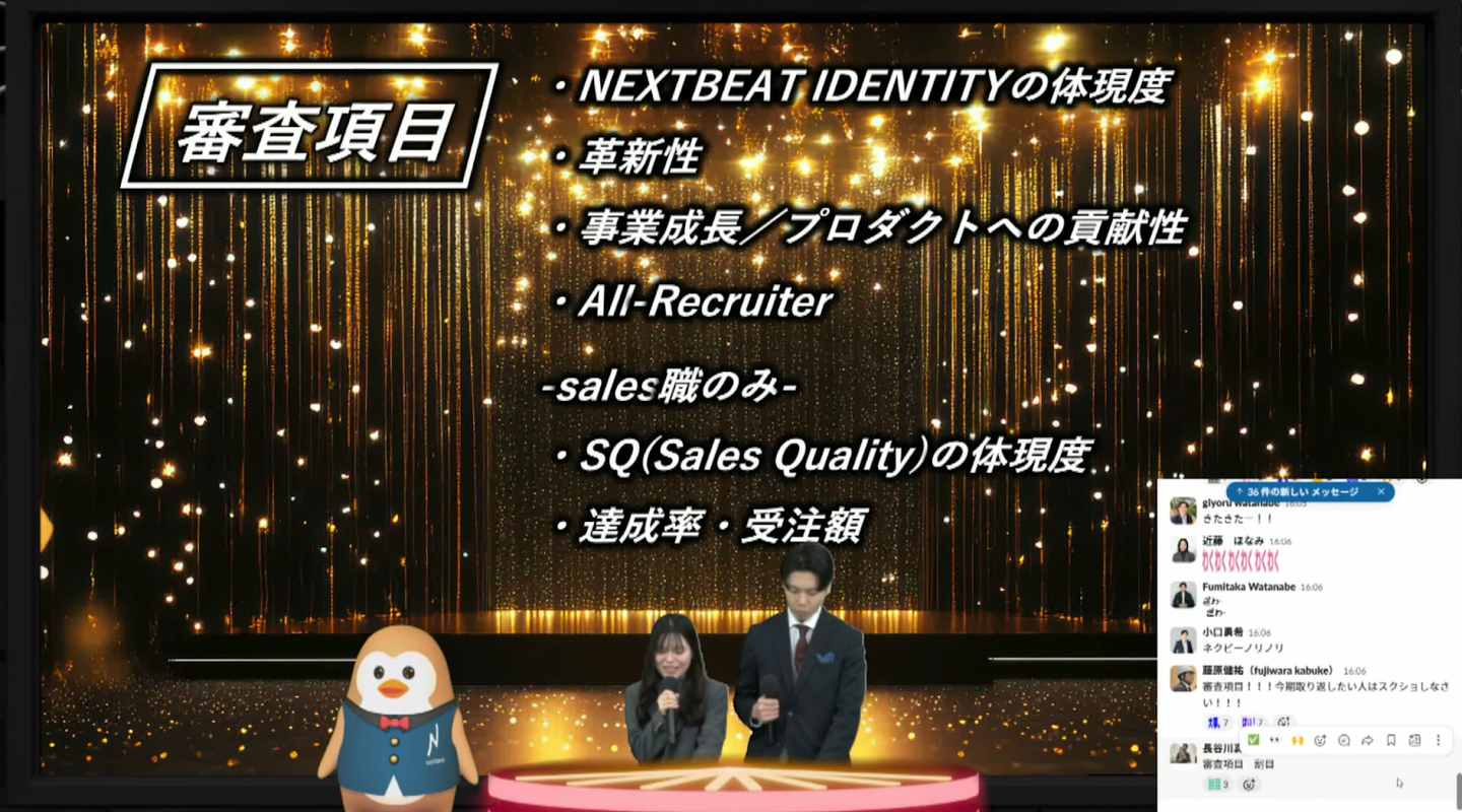 アワードには7つの賞が設けられており、ネクストビートが大切にしている「NBI(NEXTBEAT IDENTITY)」や「SQ(Sales Quality)」(セールス職のみ)など、複数の評価項目に基づいて審査されます。