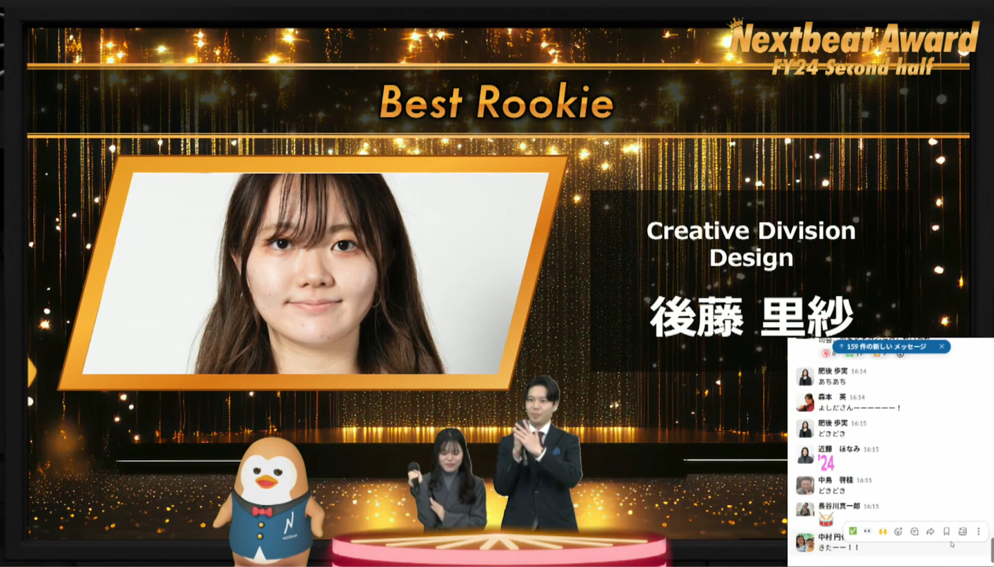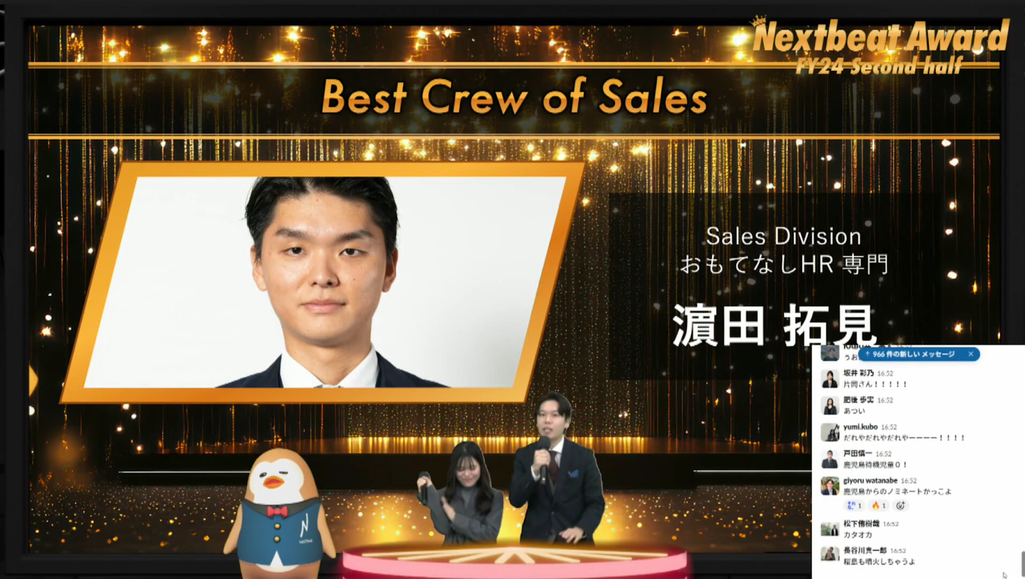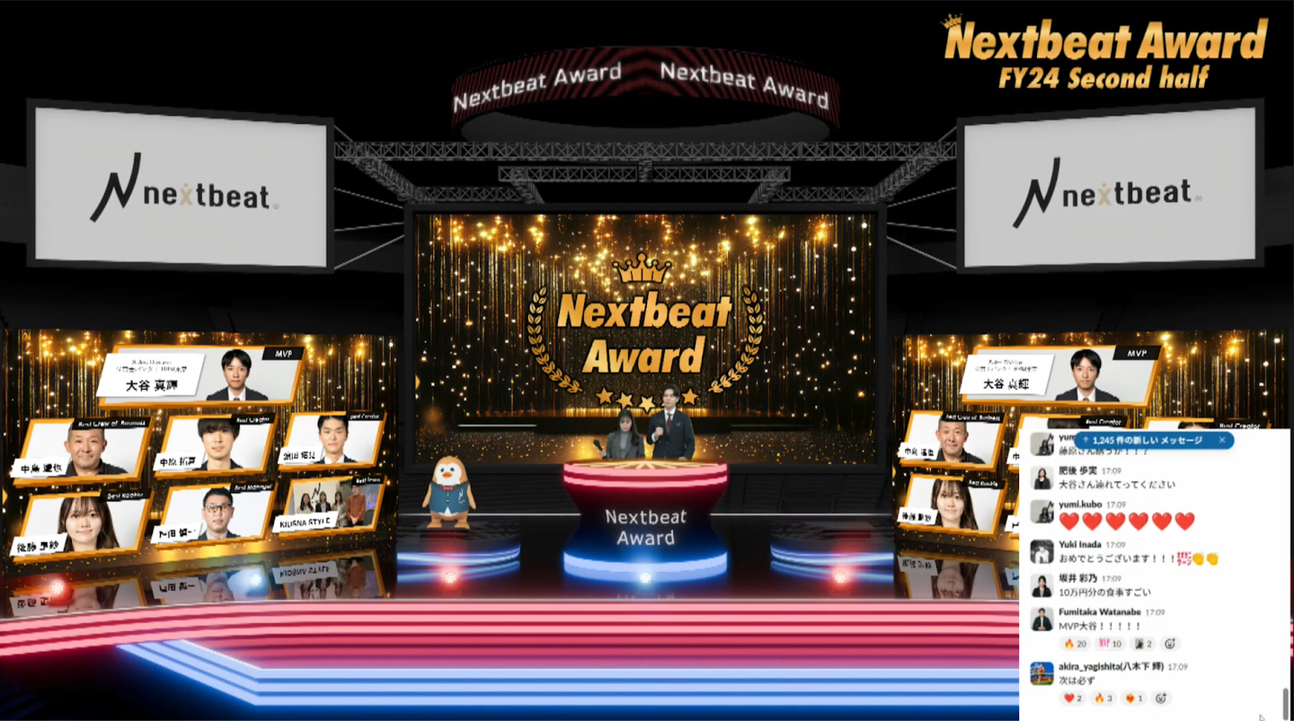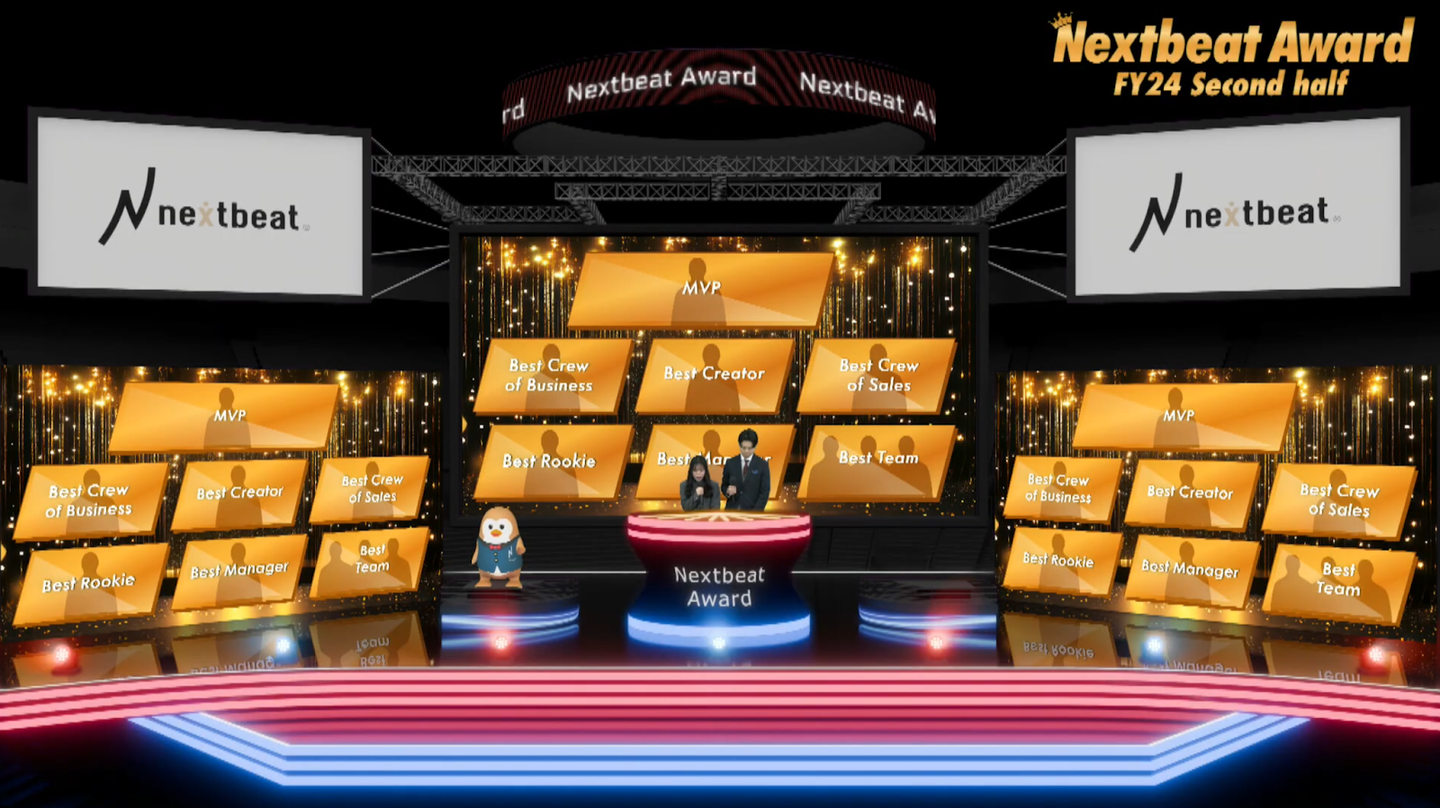 ネクストビートでは、前期に素晴らしい成果を残したクルーを称え、会社のカルチャーや価値観を体現した方を表彰する「Nextbeat Award」を開催しています。このアワードは、全社を挙げてクルーの挑戦と成長を称賛する場であり、受賞理由や具体的な成果が発表されます。