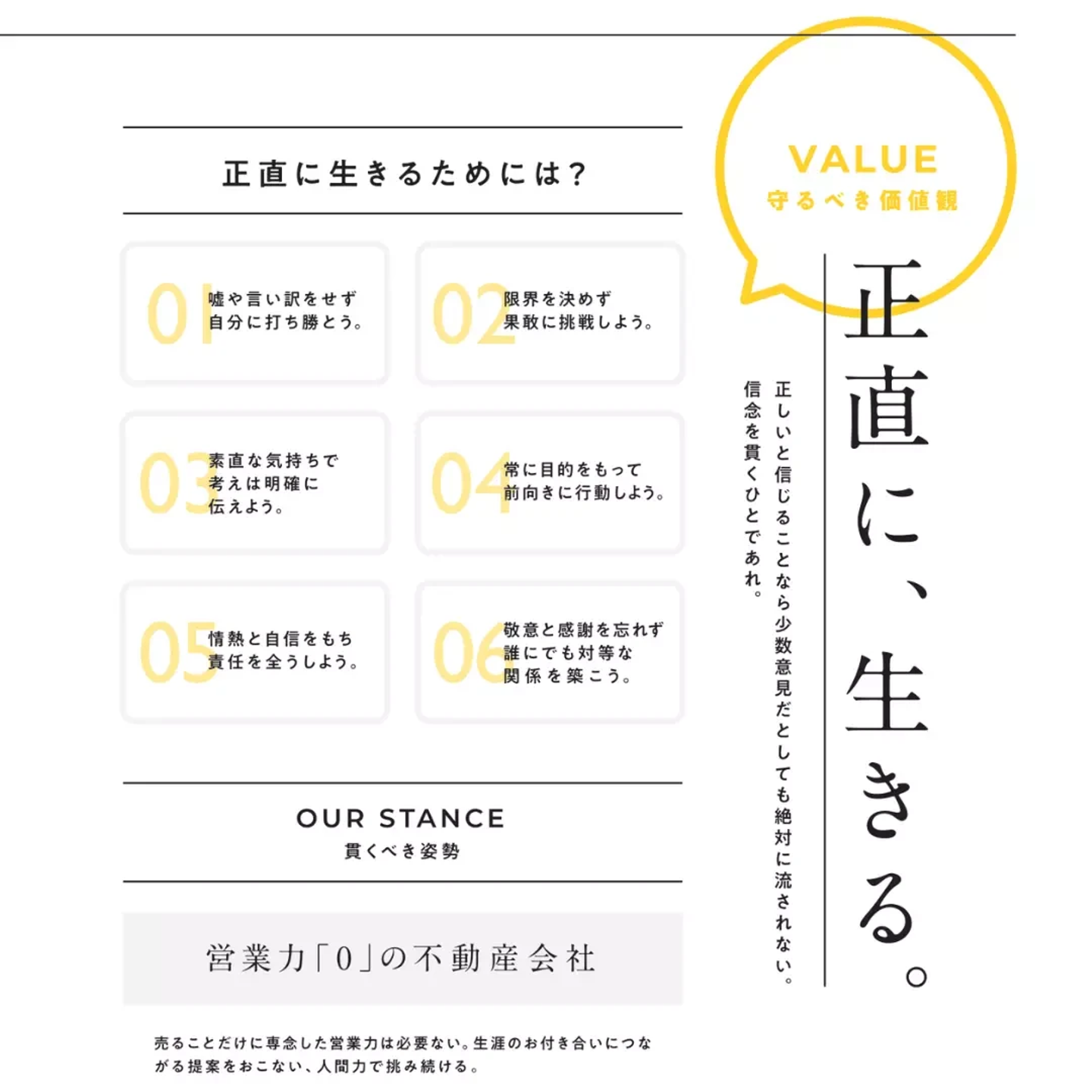 ネクスウェイブでは、ビジョンマップに共感してくれる方は前提として、「正直に生きるためには?」の6項目を満たせる方を採用しています。VALUEを体現することが、MISSION・VISIONの実現にもつながります。
