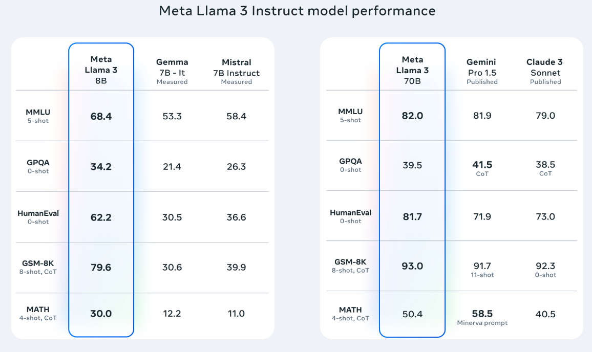 As can be seen from the below benchmarks, the 8B Llama 3 model is nearly as powerful as the biggest Llama 2 model at 70B parameters.