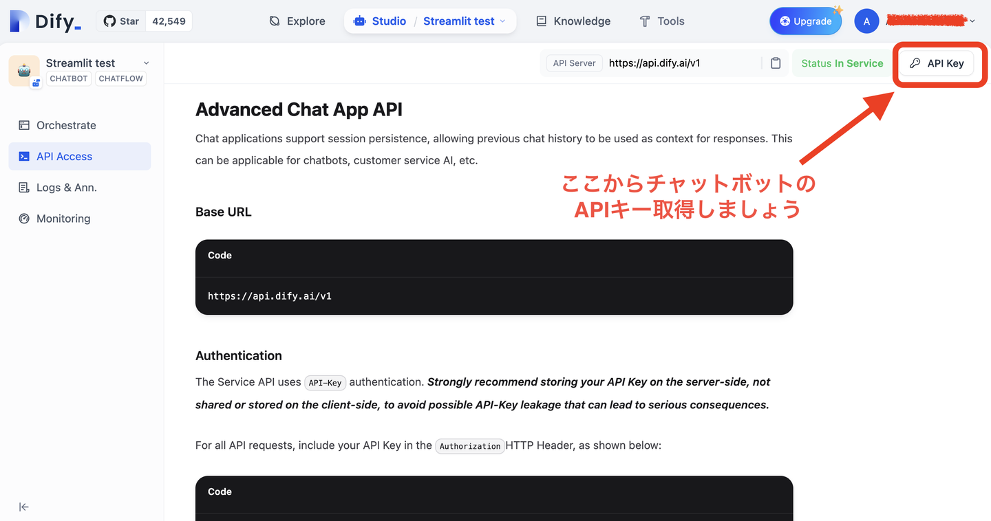 アプリケーションの設定が完了したら、「API Access」タブからAPIキーとエンドポイントURLを取得します。これらは後でStreamlitアプリケーションと連携する際に使用します。