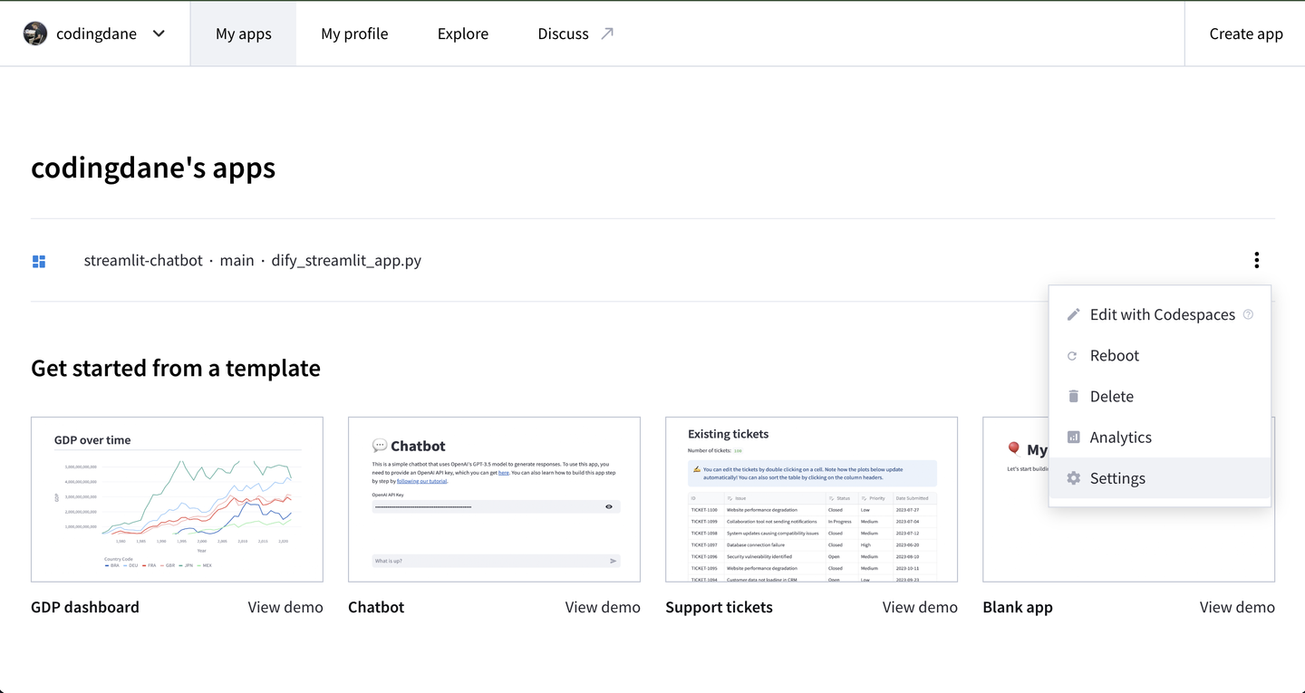 Streamlit Cloudのダッシュボードで「New app」ボタンをクリックし、GitHubリポジトリ、ブランチ、メインのPythonファイル(dify_streamlit_app.py)を選択します。DifyのAPIキーは「Settings」の「Secrets」で、環境変数(APIキーなど)が追加できます!