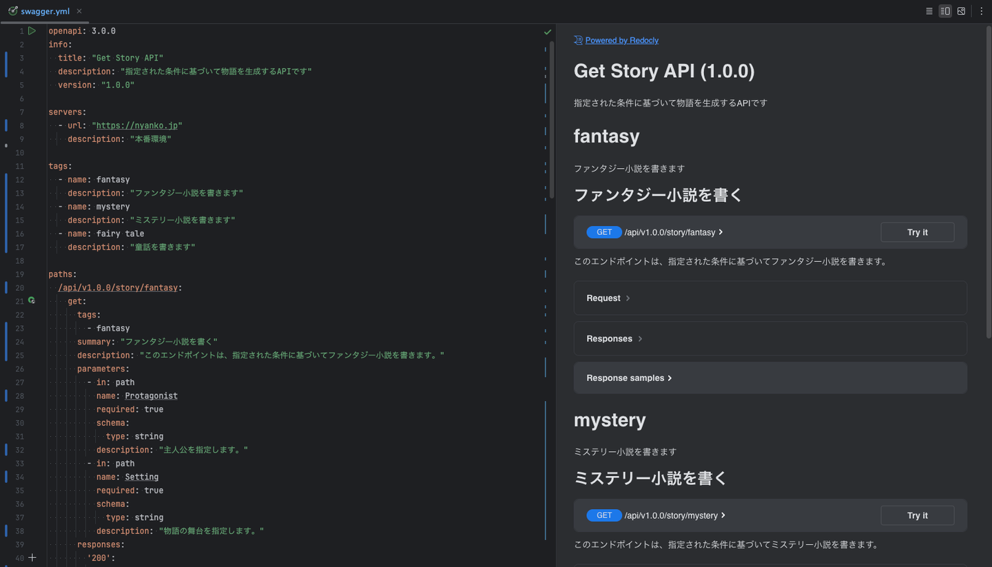 初心者でも簡単にAPI仕様書が書けて便利でした!そして、エンドポイントとパラメータを何らかのLLMに渡せば、大体仕上げてくれるのもよきポイントでした()
