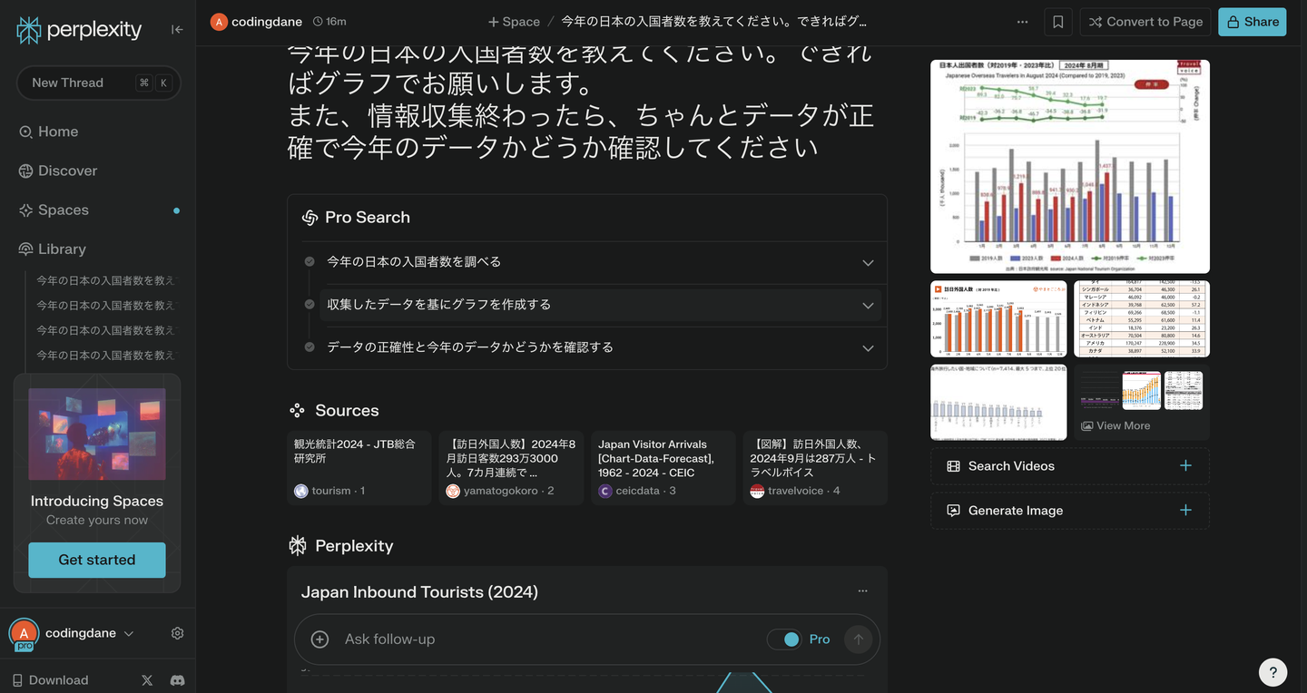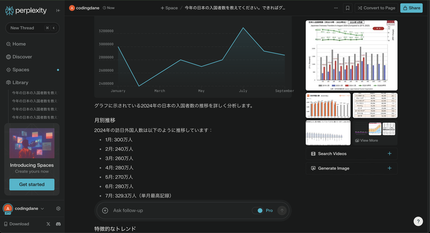 Perplexityに先ほどの「今年の日本の入国者数を教えてください。できればグラフでお願いします。また、情報収集終わったら、ちゃんとデータが正確で今年のデータかどうか確認してください。」というプロンプトを入れてみたら、データの上にちゃんとグラフも作ってくれます。