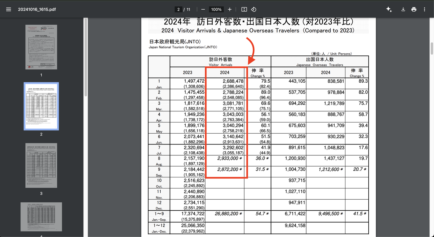そのテーブルにまとまっていた数字がJNTO(日本政府観光局)のサイトのPDFファイルから取得された数字のようでした。