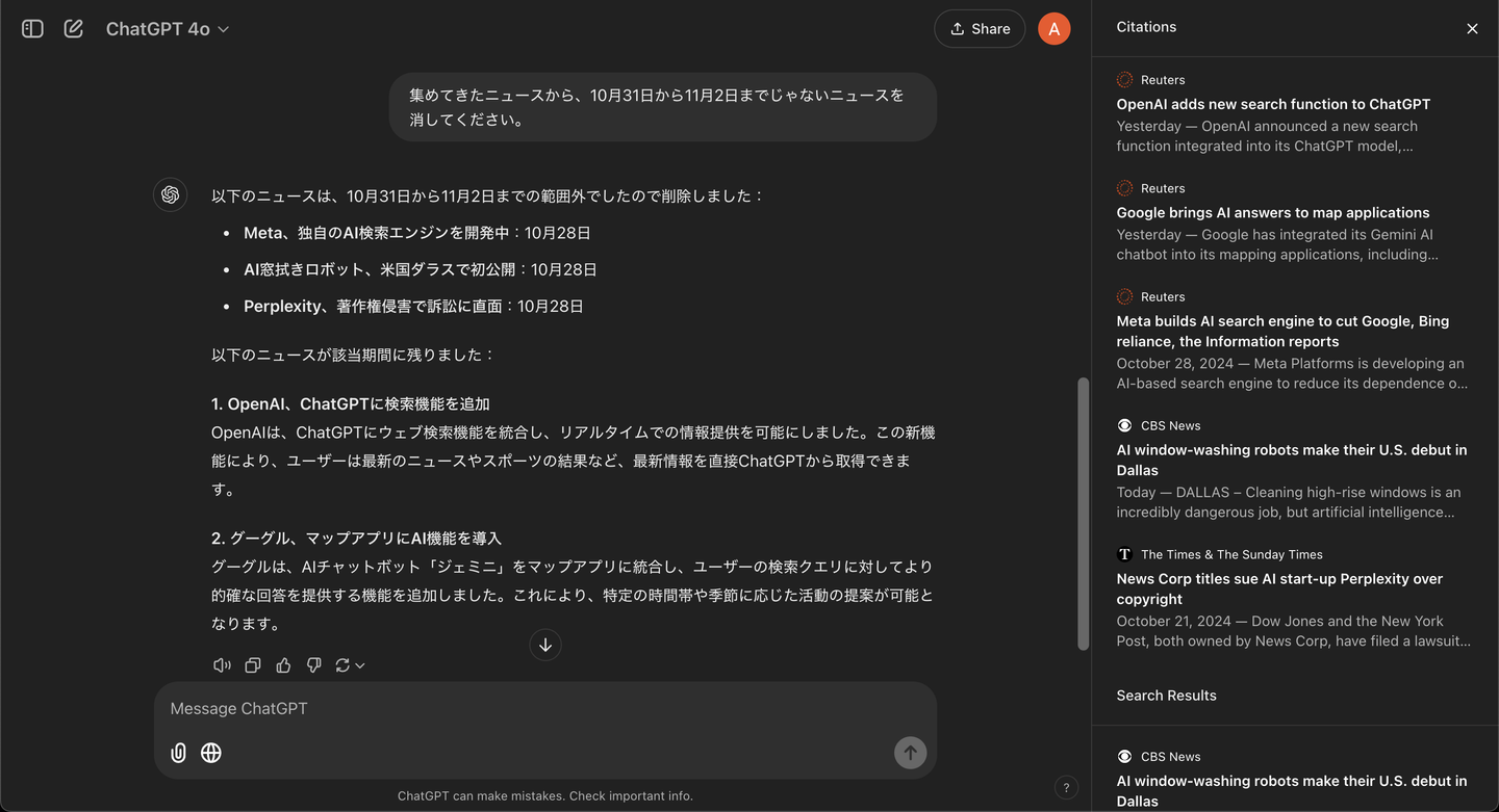 しかし、最新の情報を取得するとはいえ、特定の期間のニュースを集めてとお願いしたところで、必ずその指示に従ってくれるとは限らないみたいです。そこは注意すると良いかもしれないです。
