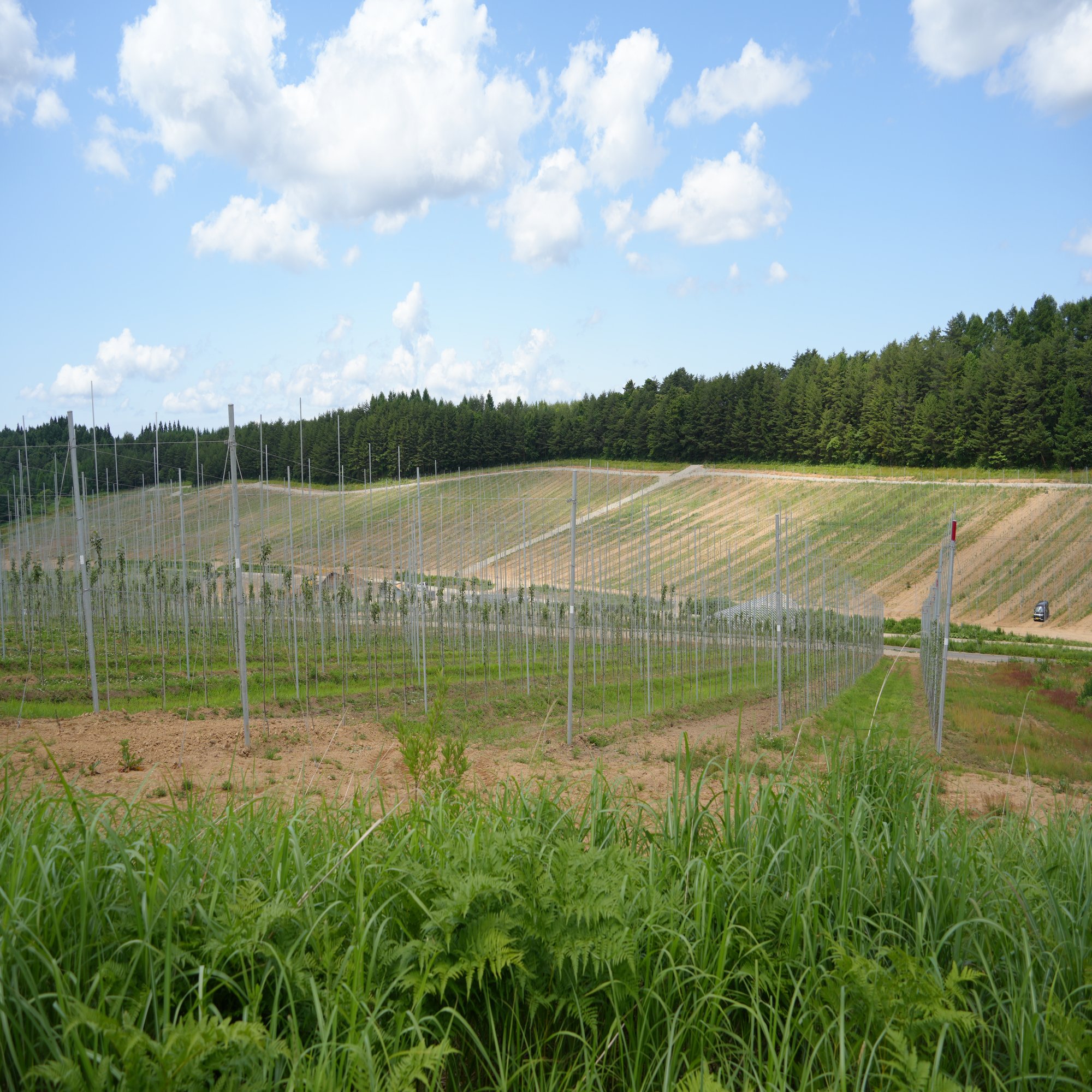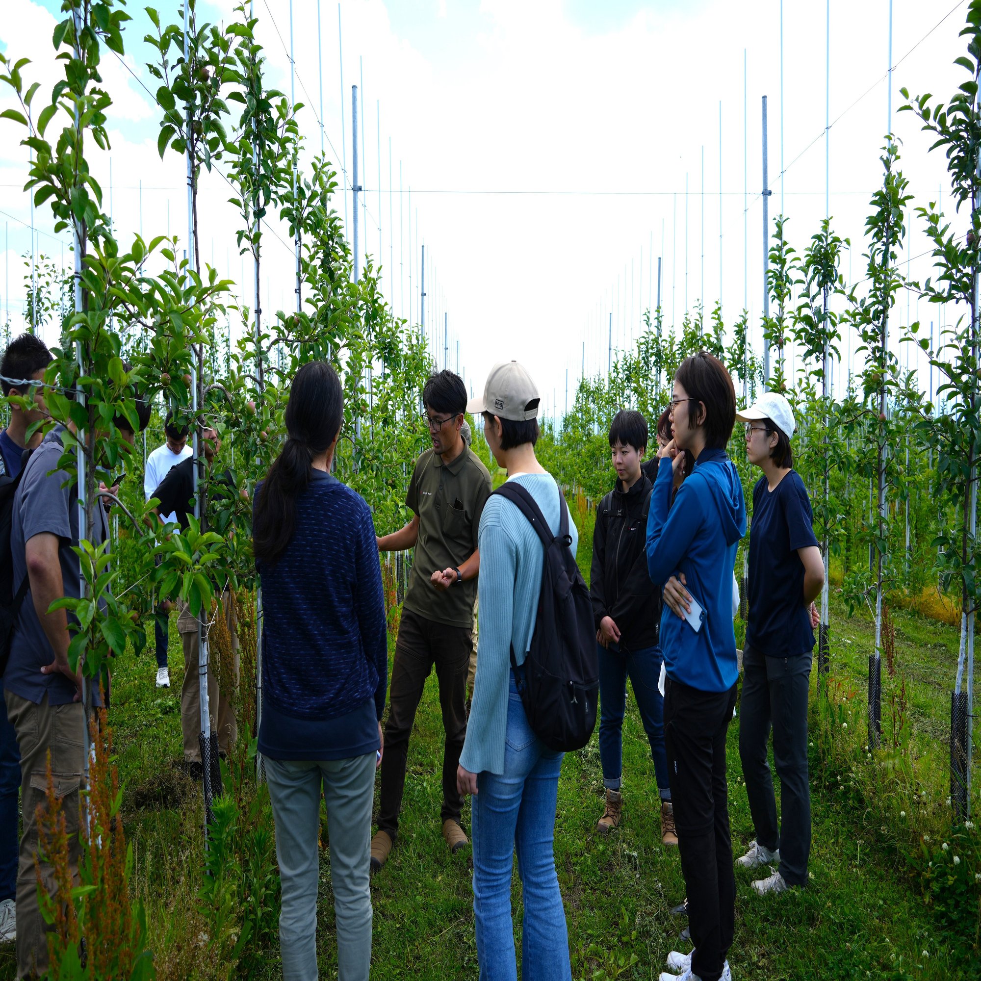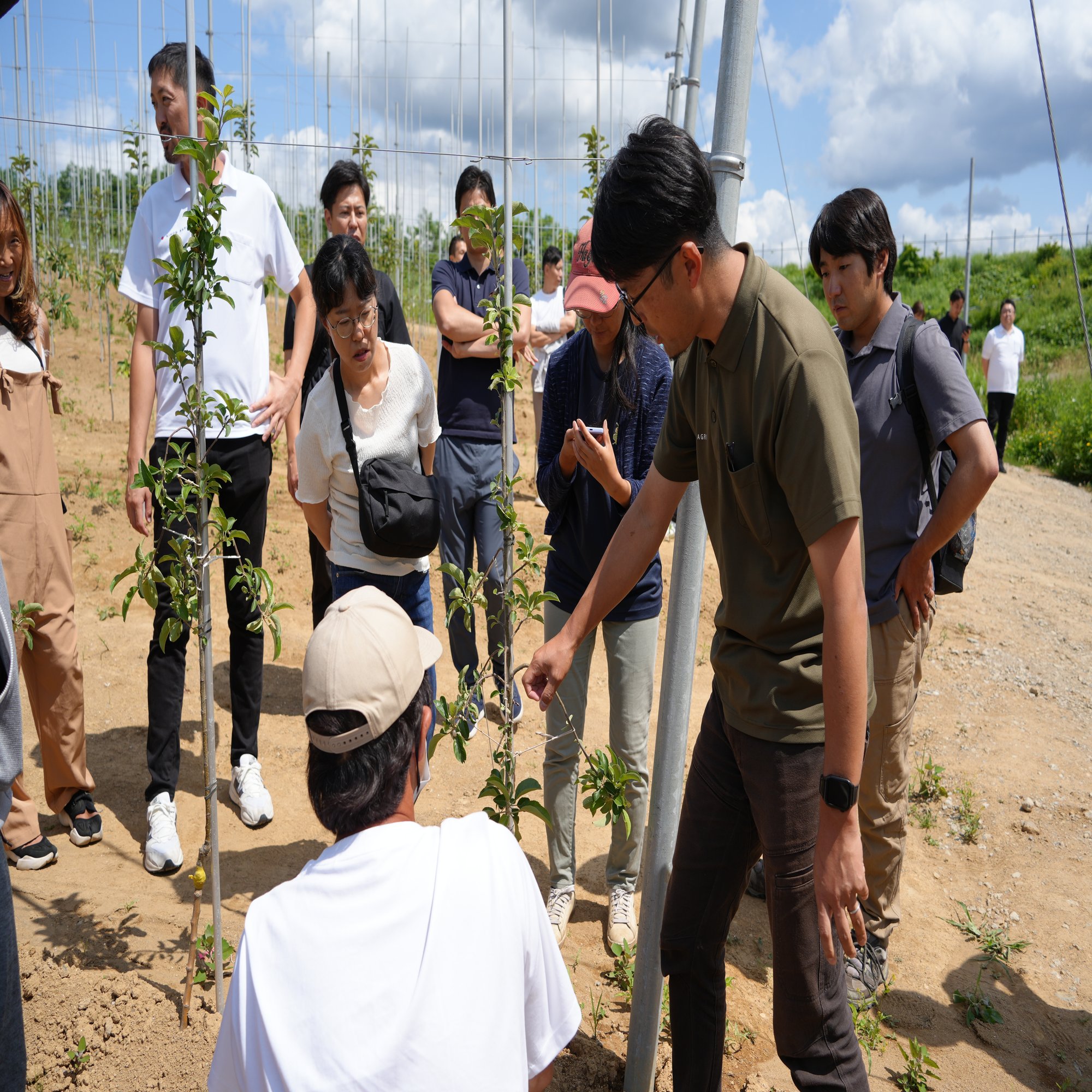 総勢50名が参加したりんご事業部ツアーは生産の現場からスタート。他の品目に従事するメンバーが広大なりんご園地を前に圧倒されていました…!