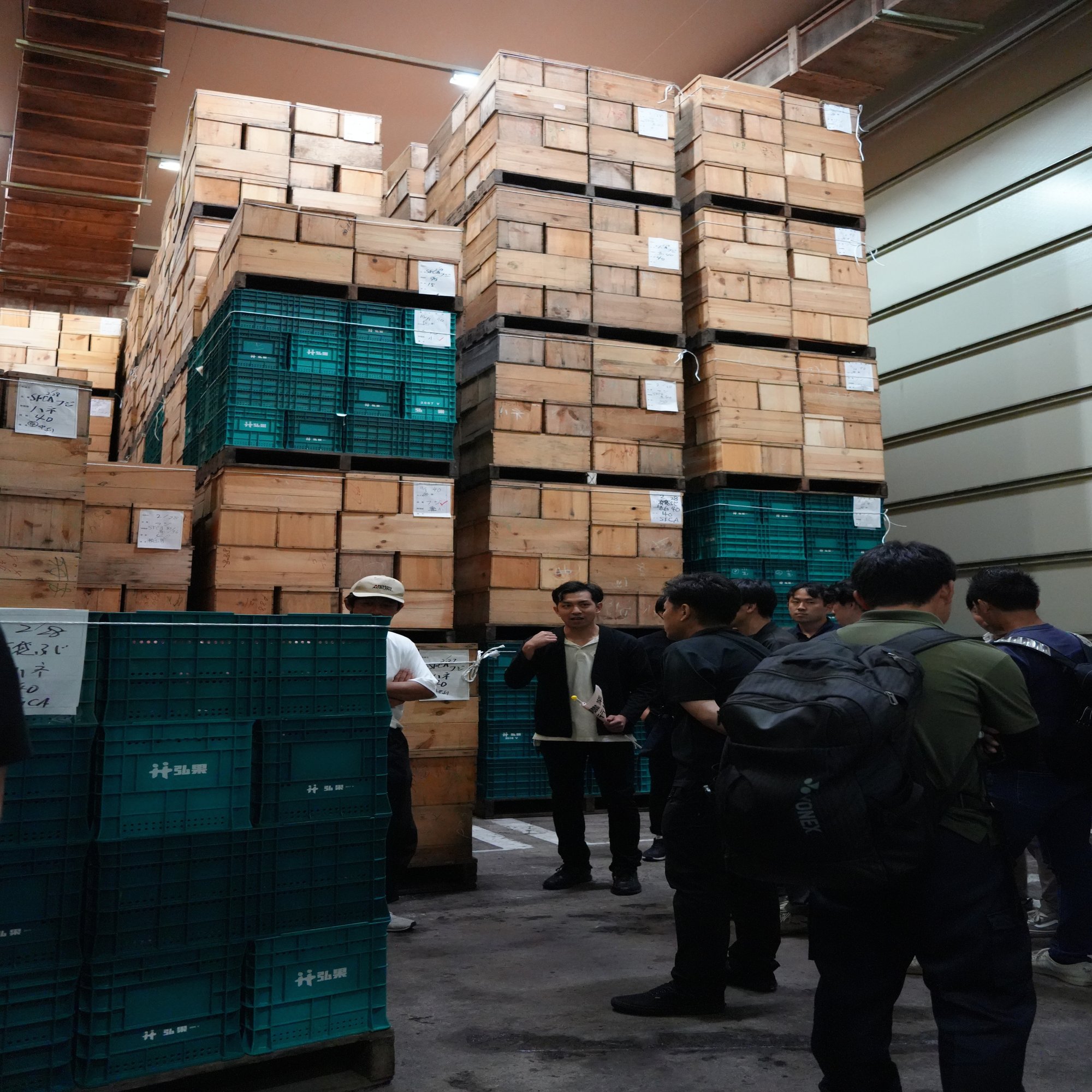 続いての選果場見学では、高く積みあがる木箱や、巨大冷蔵庫の寒さに驚きながらも、真剣なまなざしで説明を聞く姿が印象的でした。