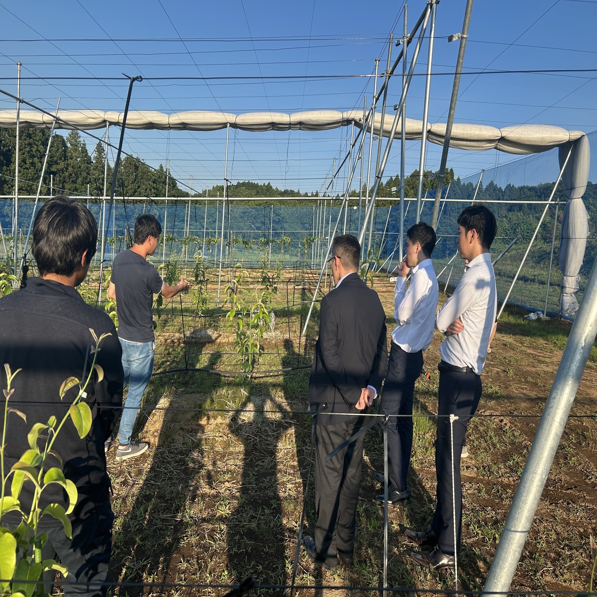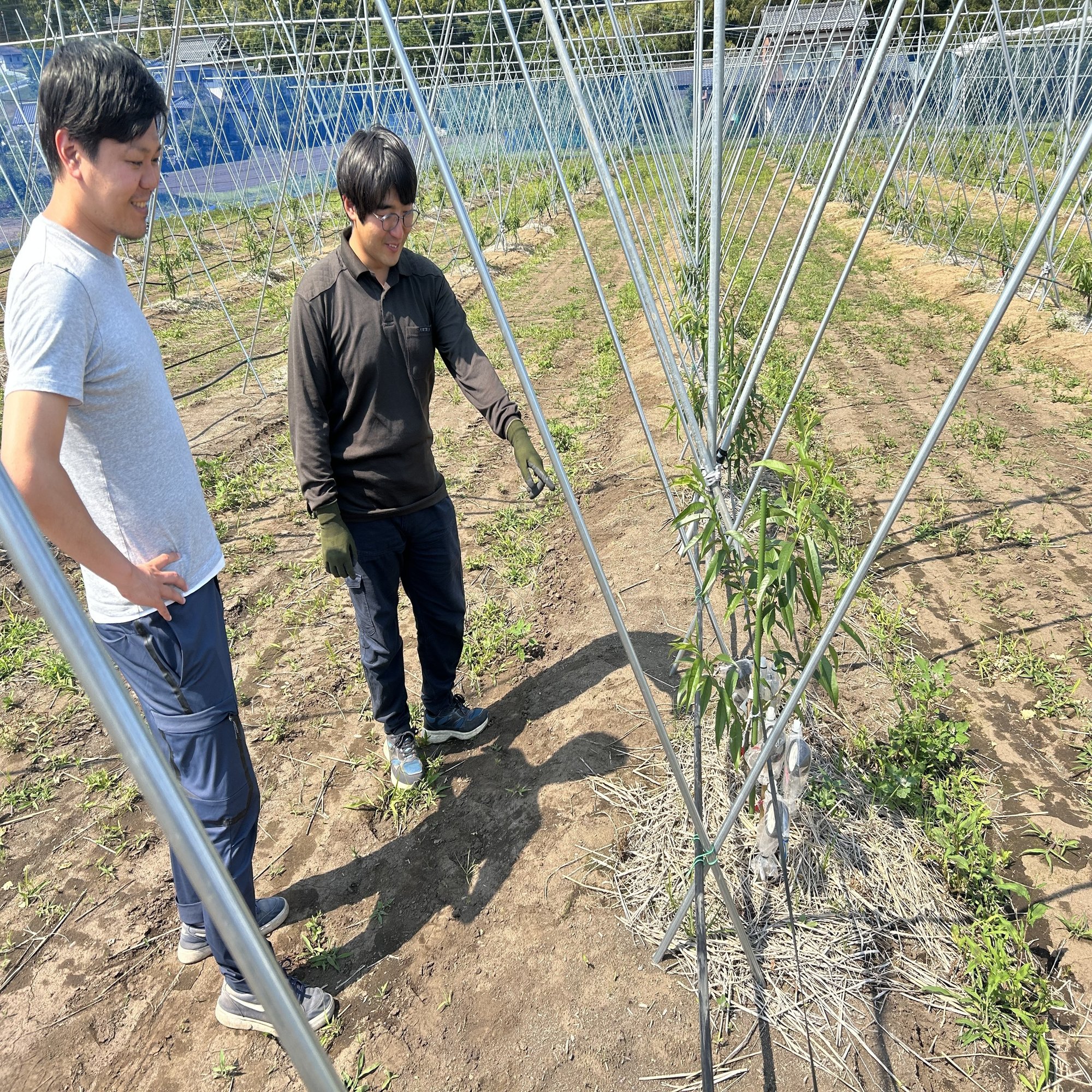 入社してからやりがいに感じたことでいうと…園地拡大に際して、海外ではすでに普及しているNARO-V(V字仕立て)を日本でも省力樹形として国に認めてもらい、無事補助金交付決定までこぎつけたことですね…!なし・ももチームの栽培アドバイザーでもあるお師匠さんが研究レベルでは実績やデータを積み重ねていましたが、営農レベルでは国内初の事例として導入したものです。お師匠さんや行政も巻き込みながら、申請を進めて国に正式に認定されたことは一つの道を開いたような達成感とやりがいを感じました。