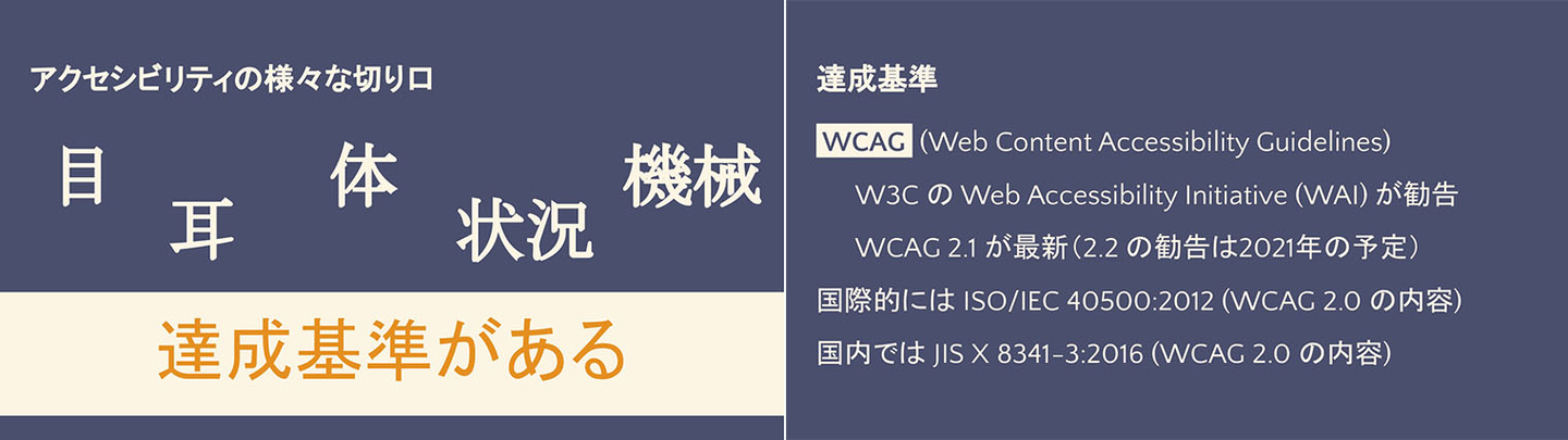このように、アクセシビリティには目、耳、Webサイトを見る状況など、さまざまな切り口があり、そこには国際的な達成基準WCAGがあります。