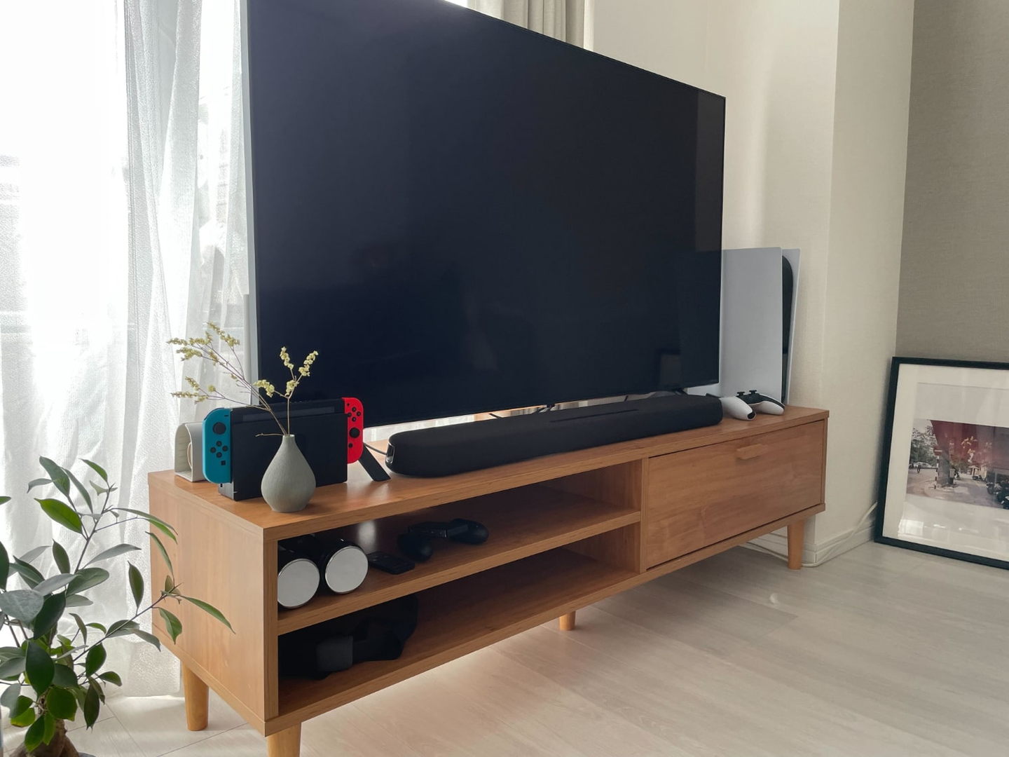 「テレビ:MTGがない日はこちらでBGMを流しながら作業しています。お祝いでもらったスピーカーを使っており、音質が良くリラックスしながら作業できます」