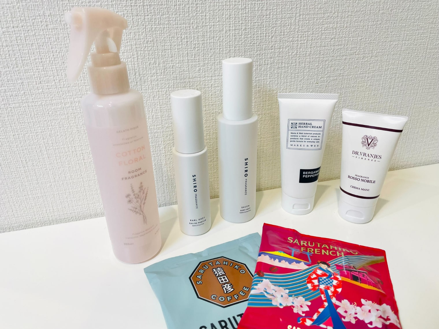 「香り系:前職の同期や友達から転職祝いでもらったフレグランス類です。気分転換に使っています。コーヒーは仕事の必需品で、美味しいドリップバッグのものを探すのが密かな趣味です」