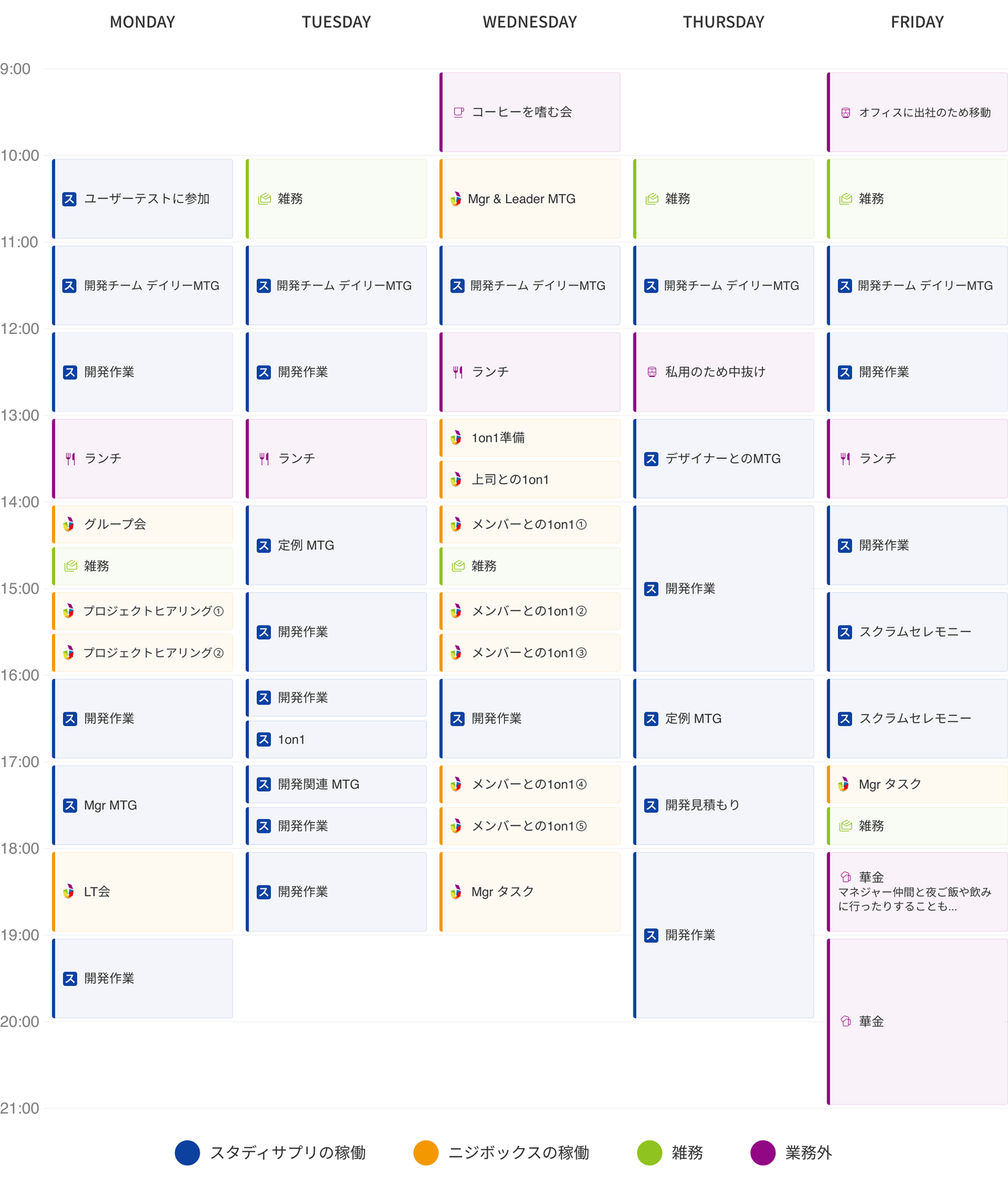 プレイヤーとしての仕事とマネジャーとしての仕事をどのように両立させているのか、興味を持っている方もいらっしゃるかもしれませんので、実際の自分のリアルな1週間のスケジュールをお見せしたいと思います。