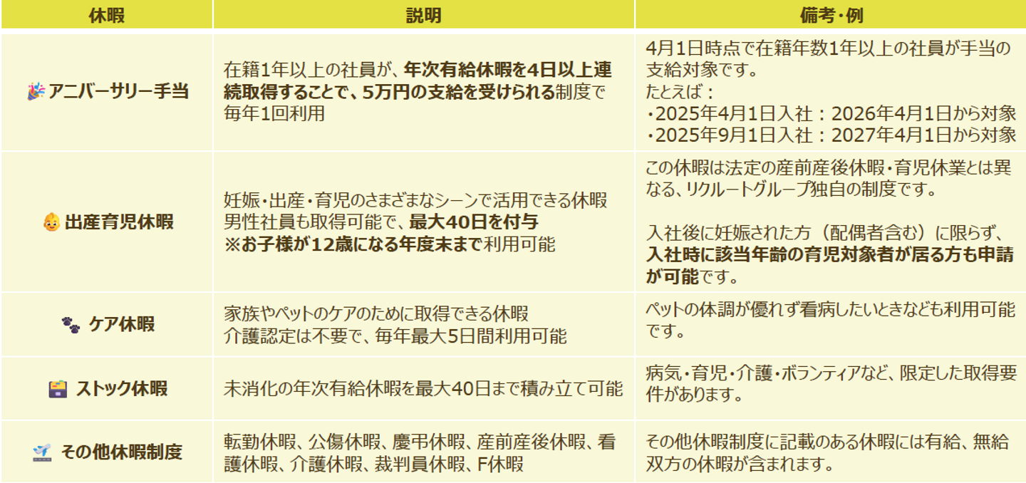 アニバーサリー手当や出産育児休暇、ケア休暇、ストック休暇はいずれもニジボックス(リクルートグループ)独自の制度です。