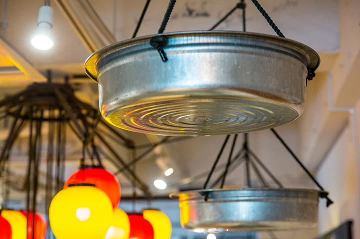 頭上にはタライが吊るされています。面白いアイデアを考えなければ、タライが落ちてくる。そんなプレッシャーを与えるために設置しました。ちなみに、奥に見えるちょうちんは月1回開催している「人間酒場」で酒場っぽい雰囲気を出すために取り付けたのですが、なんだか楽しげなのでそのままにしています。