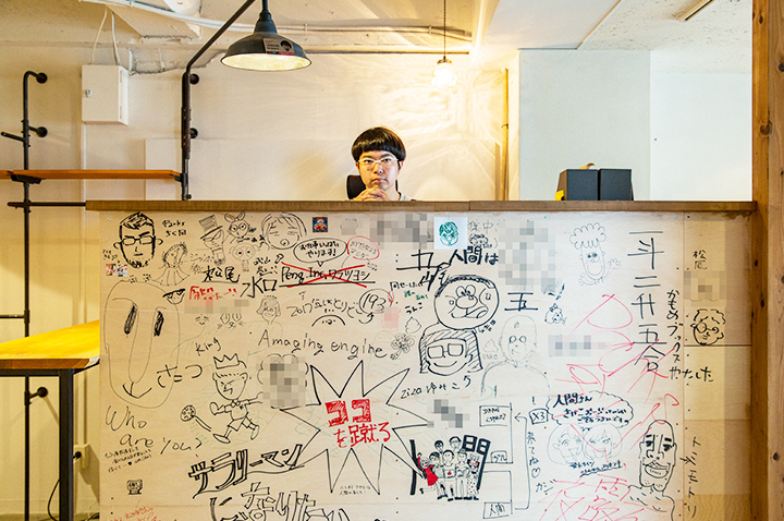 ワークスペースとミーティングスペースの間にある「山根のデスク」は、銭湯の番台をイメージした小高い台になっています。実は、ここはまだリニューアル途中で、デザインが決まっていません。「どうせ改装するから」と、リニューアルお披露目パーティで落書きOKにしたところ、社会人とは思えないひどい落書きだらけになりましたが、そのまま2年間放置されています。