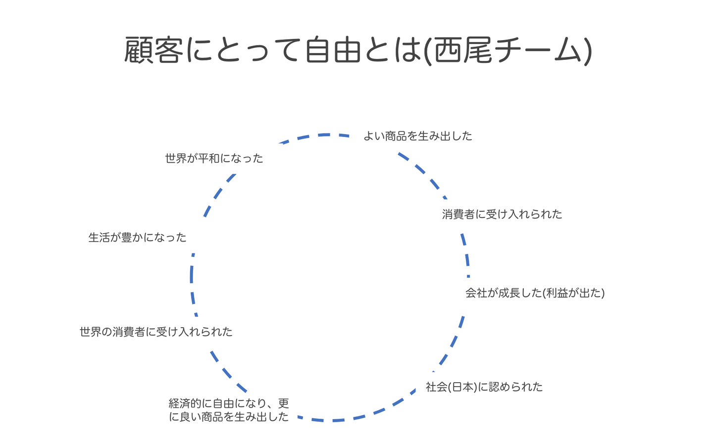 当社使命の「データで世界を自由にする」をワークショップを通じて、顧客にとって「自由(自己実現)とはなに?」「プロダクト/事業でどう成し遂げる?」を6チーム分かれて喧々諤々、議論しました。様々な視点や考えが出てきて、各メンバーの個性や思っているコトを知るいいキッカケになりました。