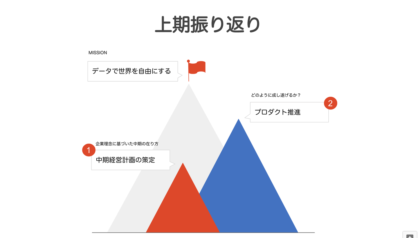 まずは吉野から上期の振り返り&下期抱負のパートでは「感謝」「変化」「成長」「目指す先」のコンテキストで熱いメッセージと共に人員増加に伴って「オフィスがパツっている」旨の発表がありました。