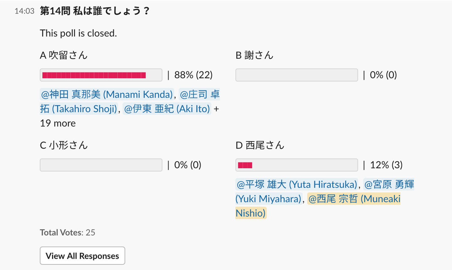 16名の新メンバーに関するクイズをslackとpolly(投票ツール)を連携し実施しましたが、まさかの事業管理のリーダー(新入社員)が全問正解させて、涼しげと豪華賞品を持って帰るという奇跡が起こり彼女のポテンシャルを感じました。