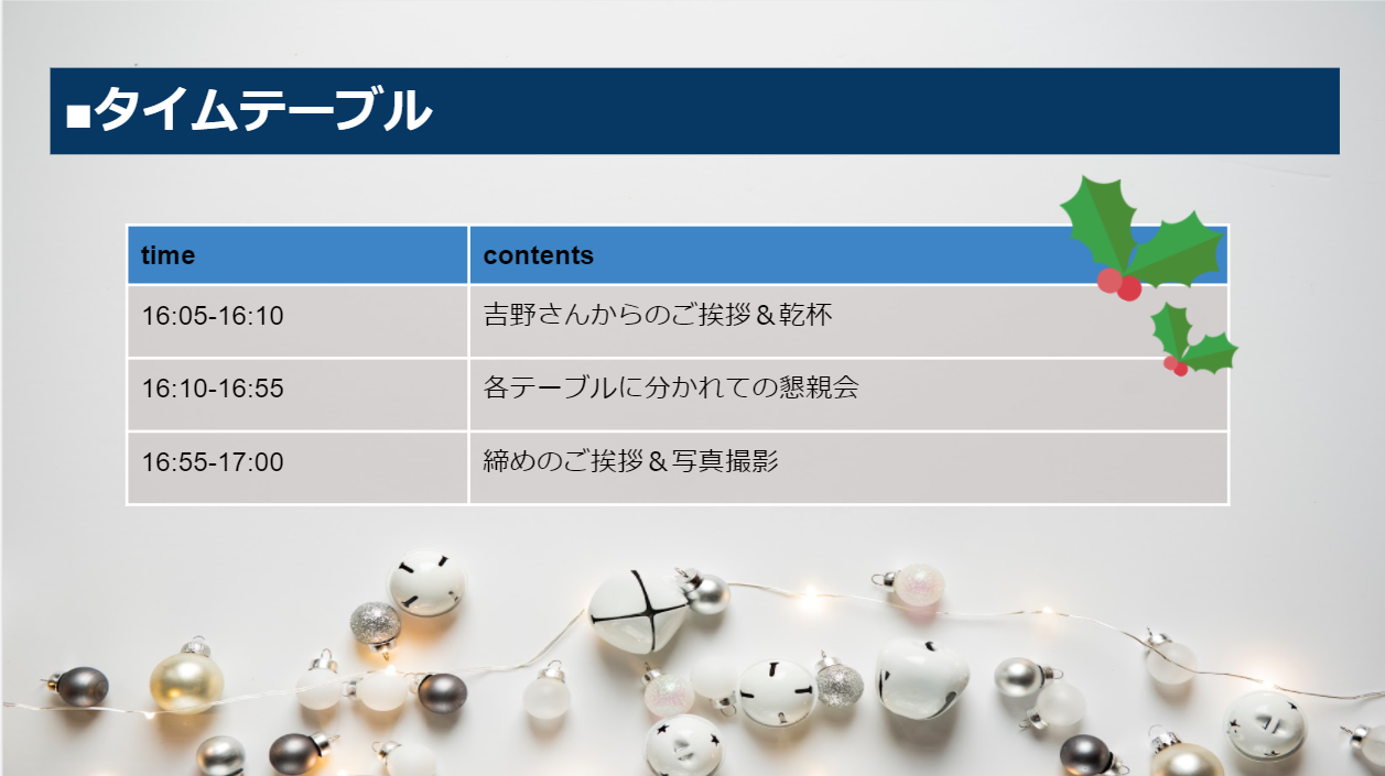 クリスマスソングのBGMが流れる中、まずは、代表吉野のご挨拶からスタート!!