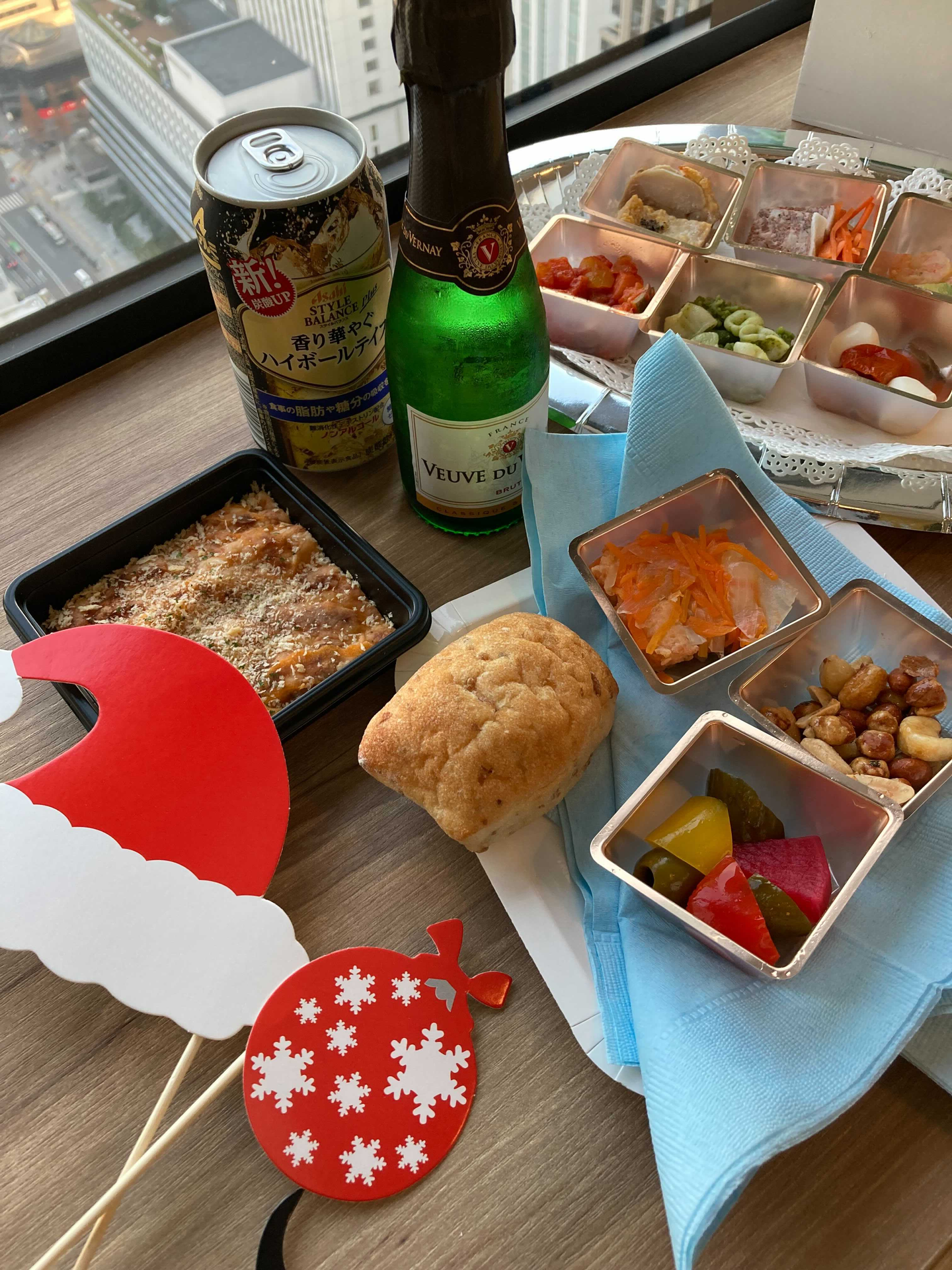 サンタのフォトプロップスやスパークリングワインもついていて、少しでもクリスマス気分が味わえたのではないかなと思います。
