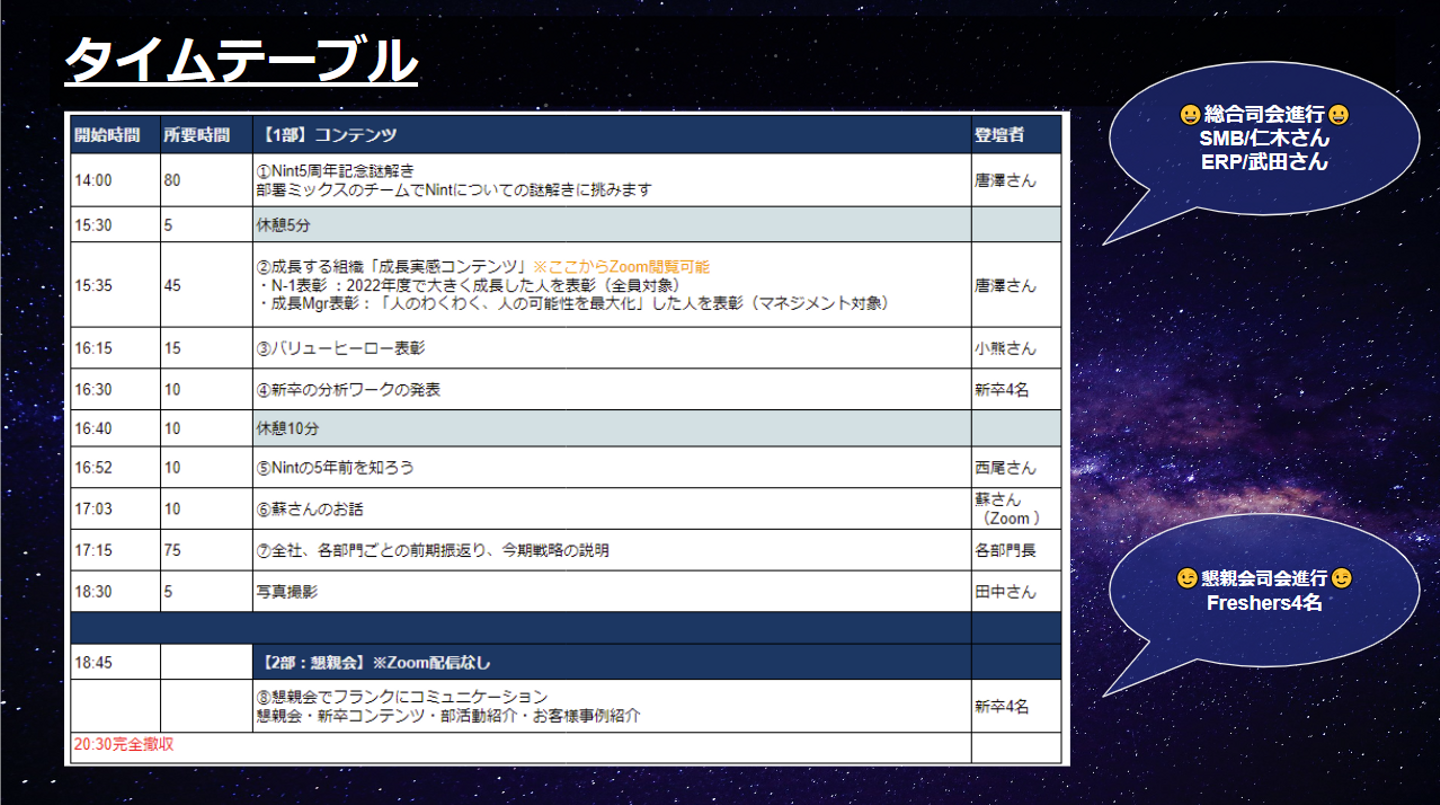 Nint5周年記念も兼ねての謎解きワークや、この1年で成長したメンバーやマネージャーの表彰、各部門の戦略発表など、短いながらも盛りだくさんのコンテンツでした。