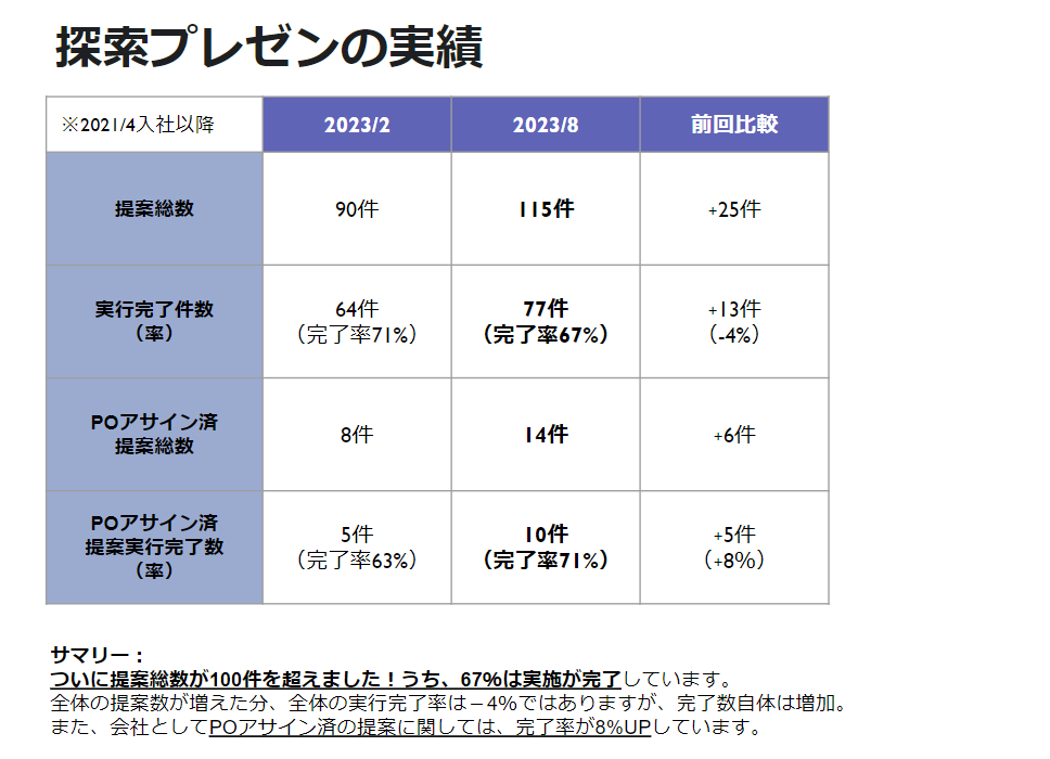 2023年8月末時点の総提案数は「115件」。その中の「77件」が実行完了しています。(実行完了率67%)