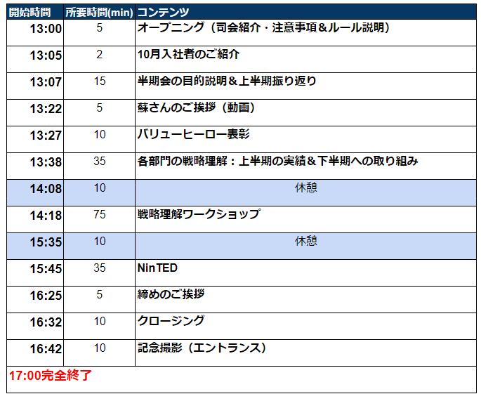 今回の半期会のテーマは「戦略理解」。運営としてはコンパクトでインパクトのある半期会にすることでした。毎回半期会では取り組みたいことが多く、結果的に1日がかりのイベントになることも多かったのですが、今回はやりたいことに選択と集中を行いました。