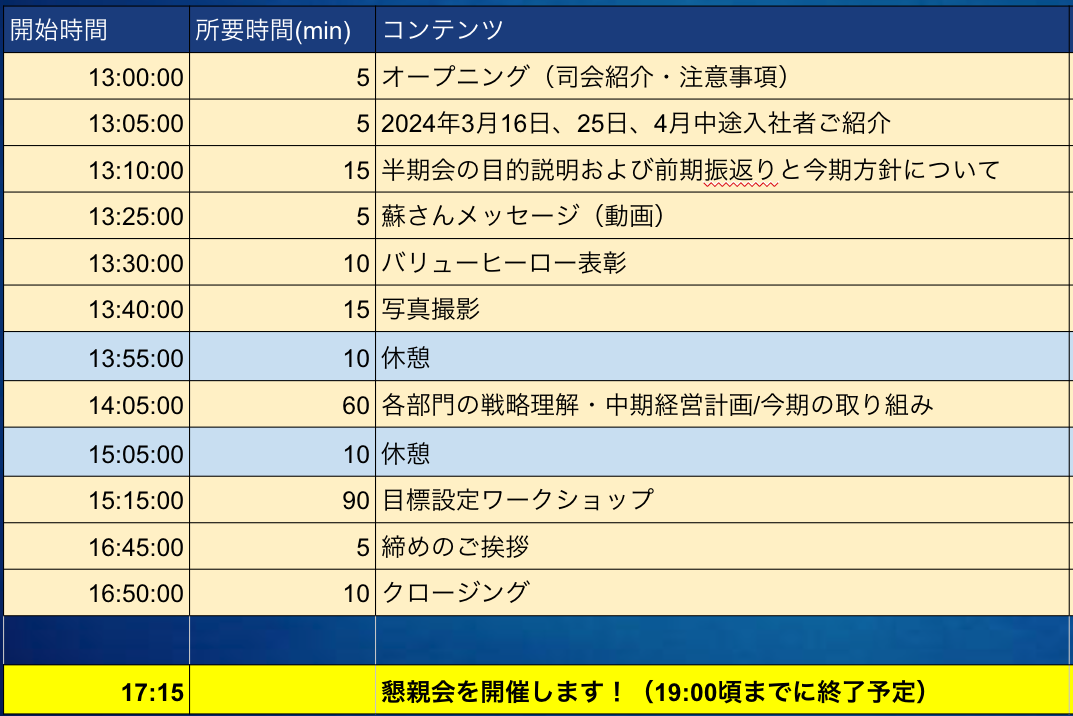代表の吉野さんや各部門長による前期(2023年度)の振返り&今期(2024年度)の方針発表から、チームの目標・個人の目標を設定するためのワークショップ、社員間の交流を深めるきっかけとなった懇親会など、非常に内容の濃い1日となりました!